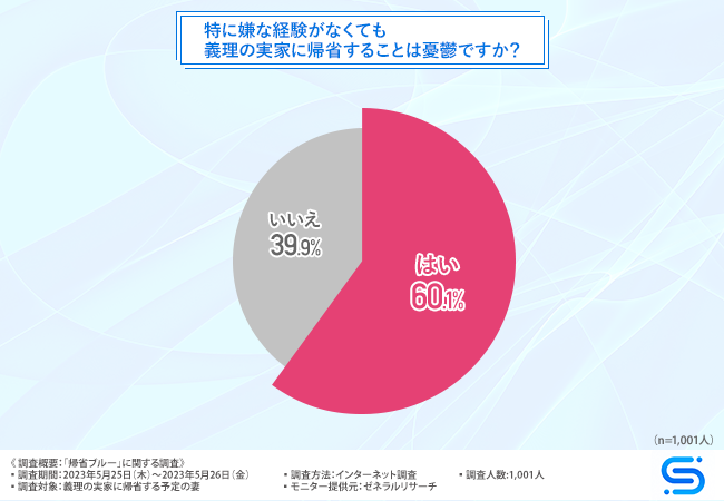 そこで、「特に嫌な経験がなくても義理の実家に帰省することは憂鬱ですか?」と質問したところ、6割以上の方が『はい(60.1%)』と回答しました。