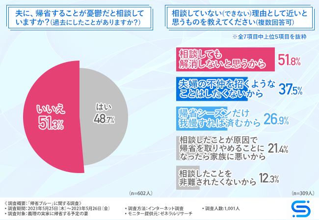 そこで、「夫に、帰省することが憂鬱だと相談していますか?(過去にしたことがありますか?)」と質問したところ、半数以上の方が『いいえ(51.3%)』と回答しました。