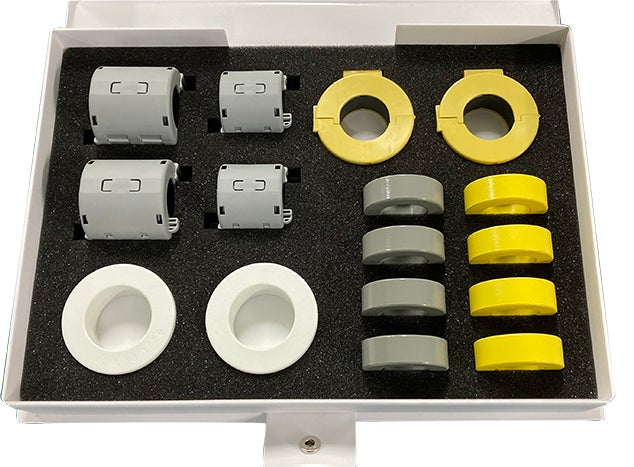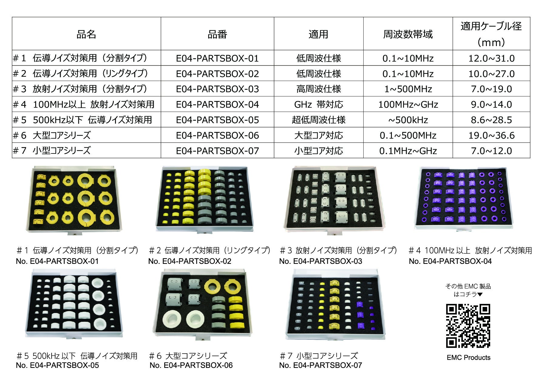 「EMC PARTS BOX」は、当社が現在販売しているフェライトコアやナノクリスタルを、対策シーンやサイズに合わせて7種類ラインアップしております。設計、試作、測定段階の実験、評価技術現場など、あらゆるシーンでご活用いただけます。