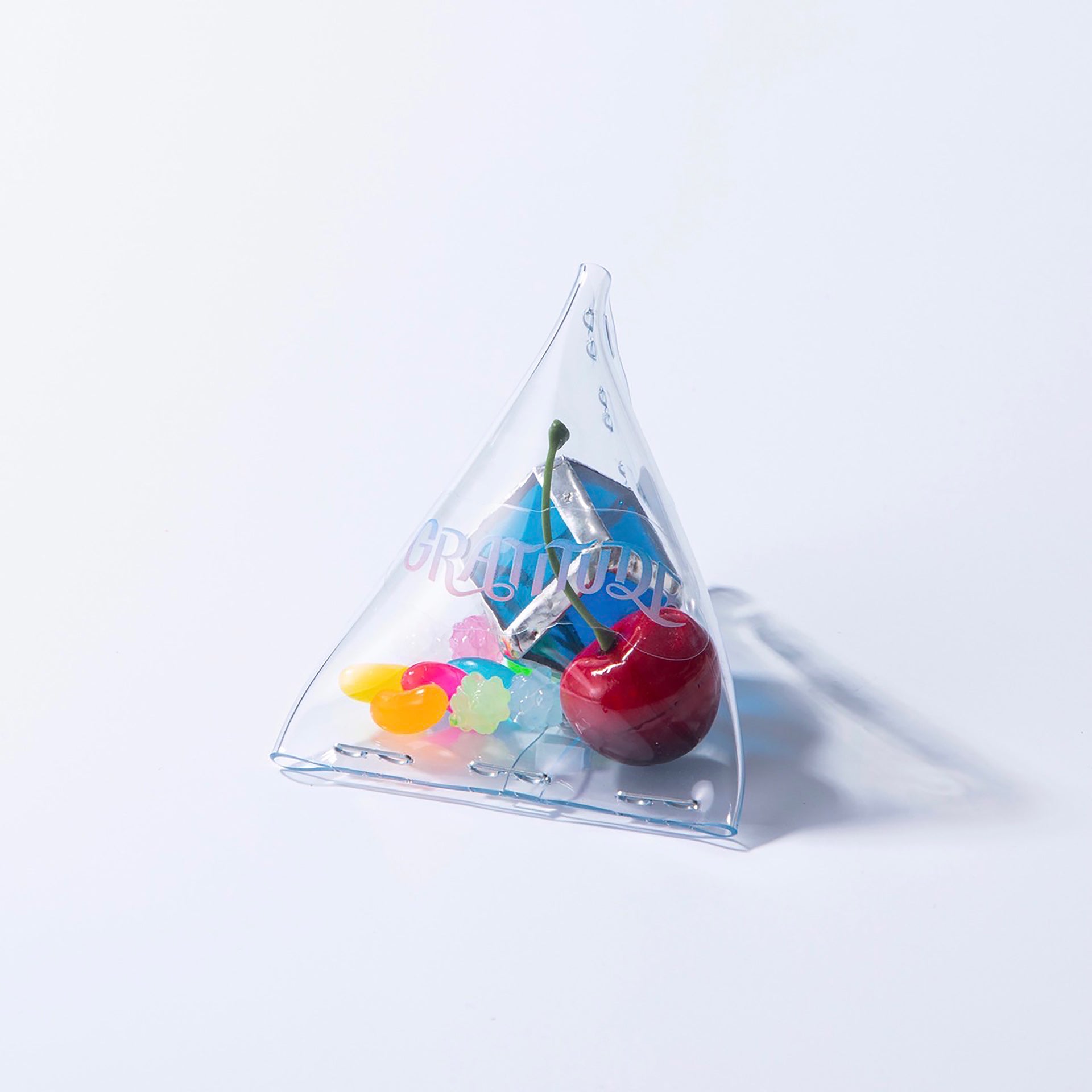 また、作品の入れ物にもこだわってみました。既製品のケースでは面白くないので、駄菓子で一口サイズのピーナッツが入っているような三角パックをイメージして、ビニーシートをから切り出したパーツをカシメとホッチキスで留め付けて、これもひとつづつ手作りしています。