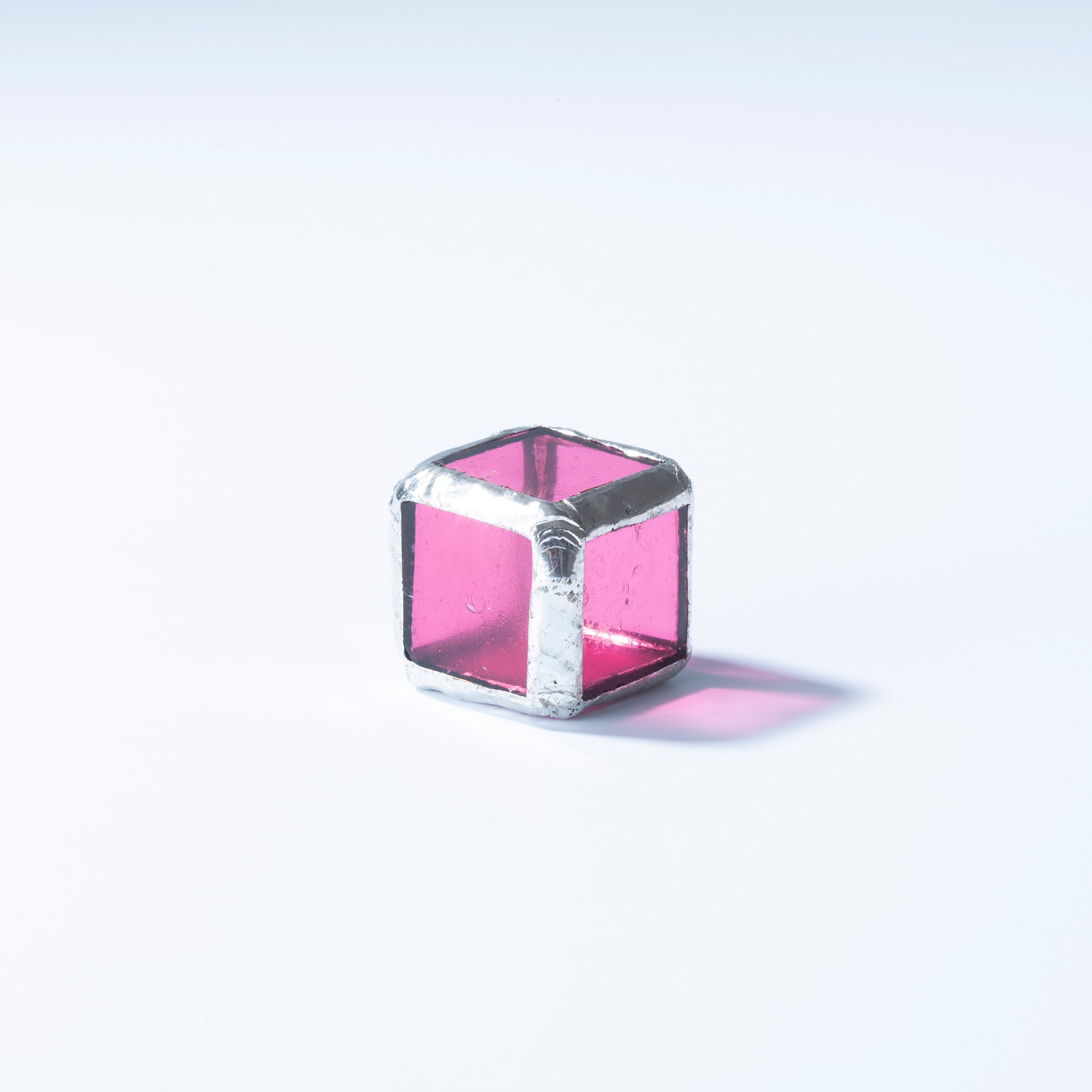 今回ご用意したのは、GRATITUDE の「IMITATION」シリーズではクリームソーダの氷などでおなじみのガラスのキューブです。ステンドグラスはどちらかというと平面での表現が多く、立体を組むにはそれなりの習熟度が必要となりますが、今回ご協力いただいたのはどなたもステンドグラスが大好きで長くやってこられた熟練の方々で、これも扱いが難しい環境に配慮した錫ハンダを使用して、一点一点手作りで作成していただきました。