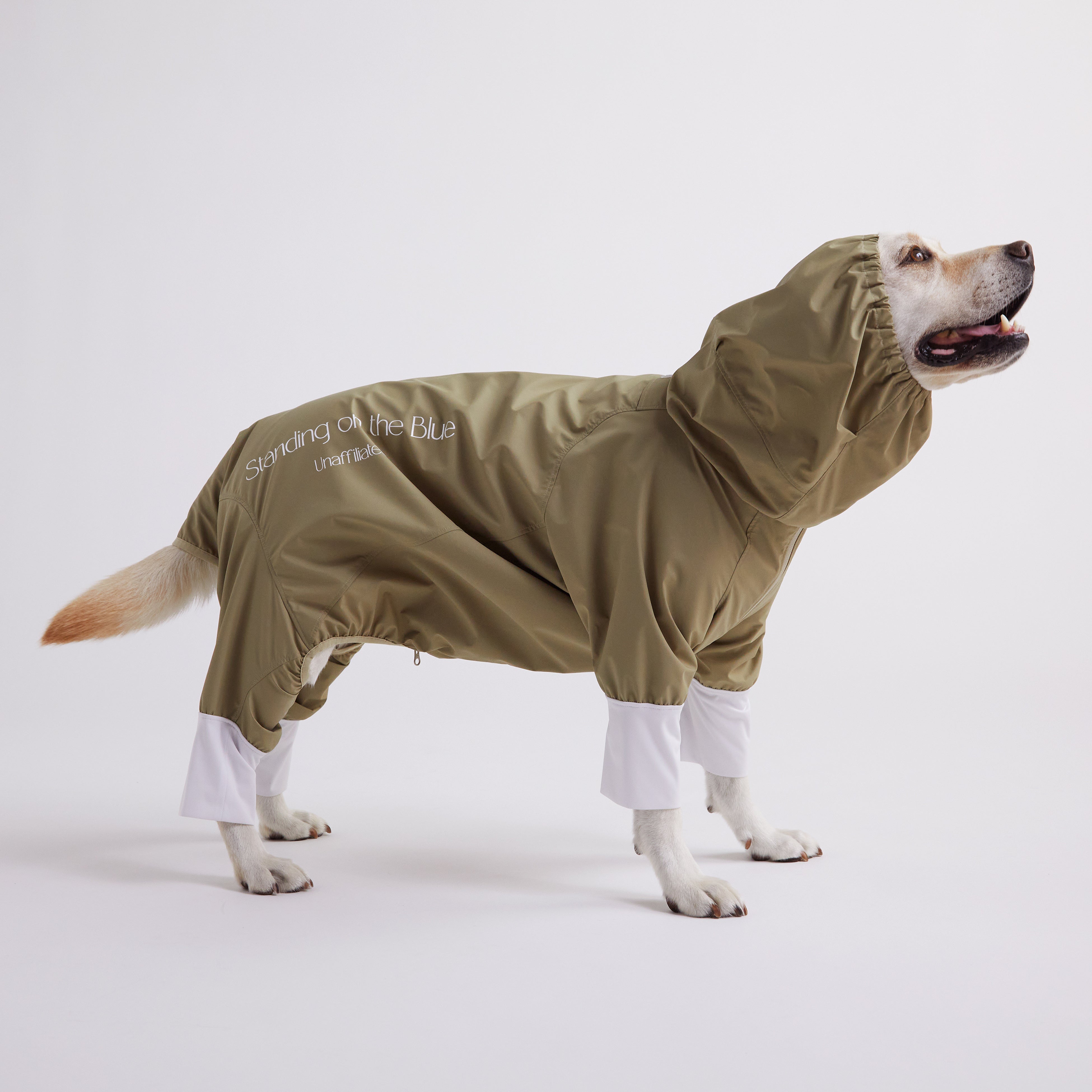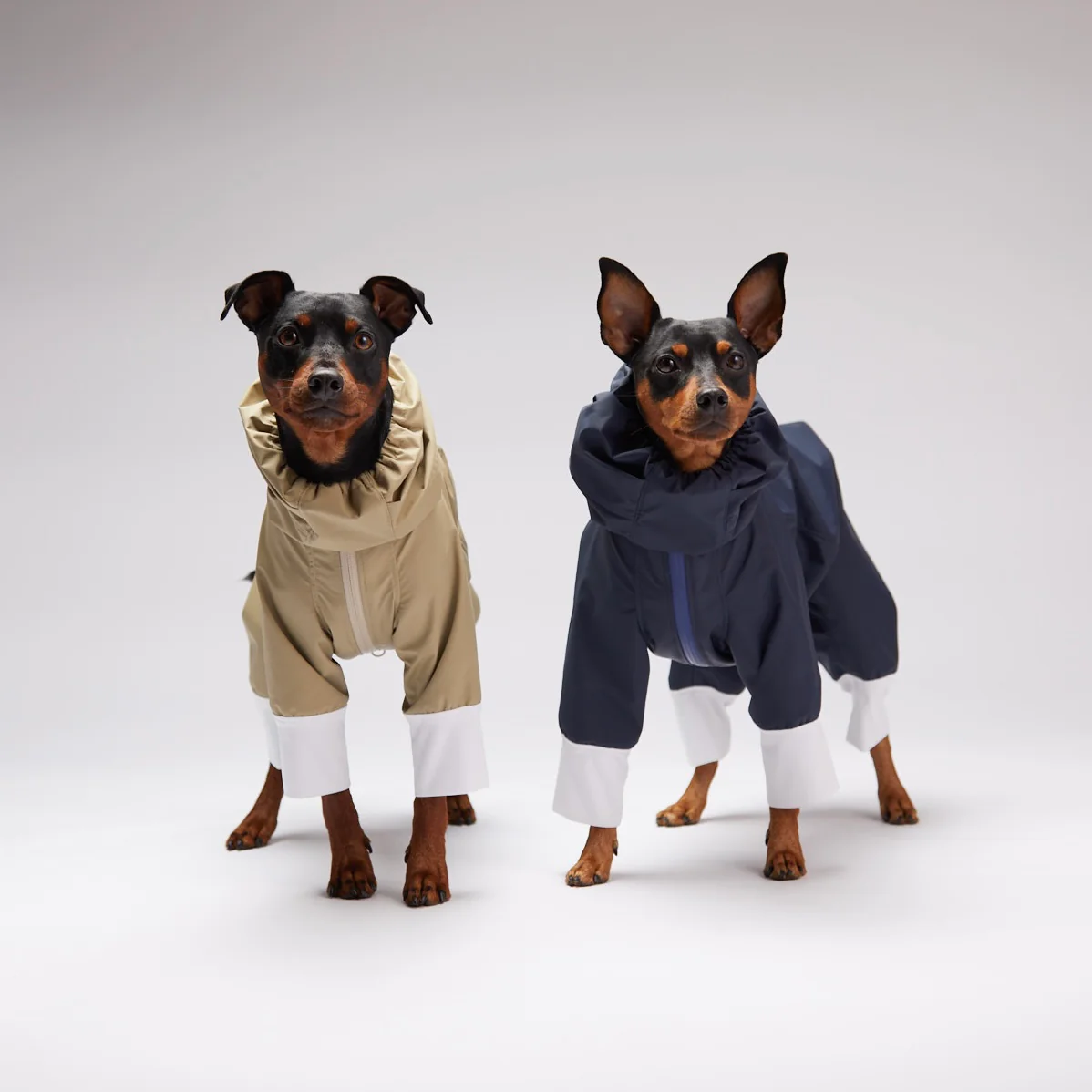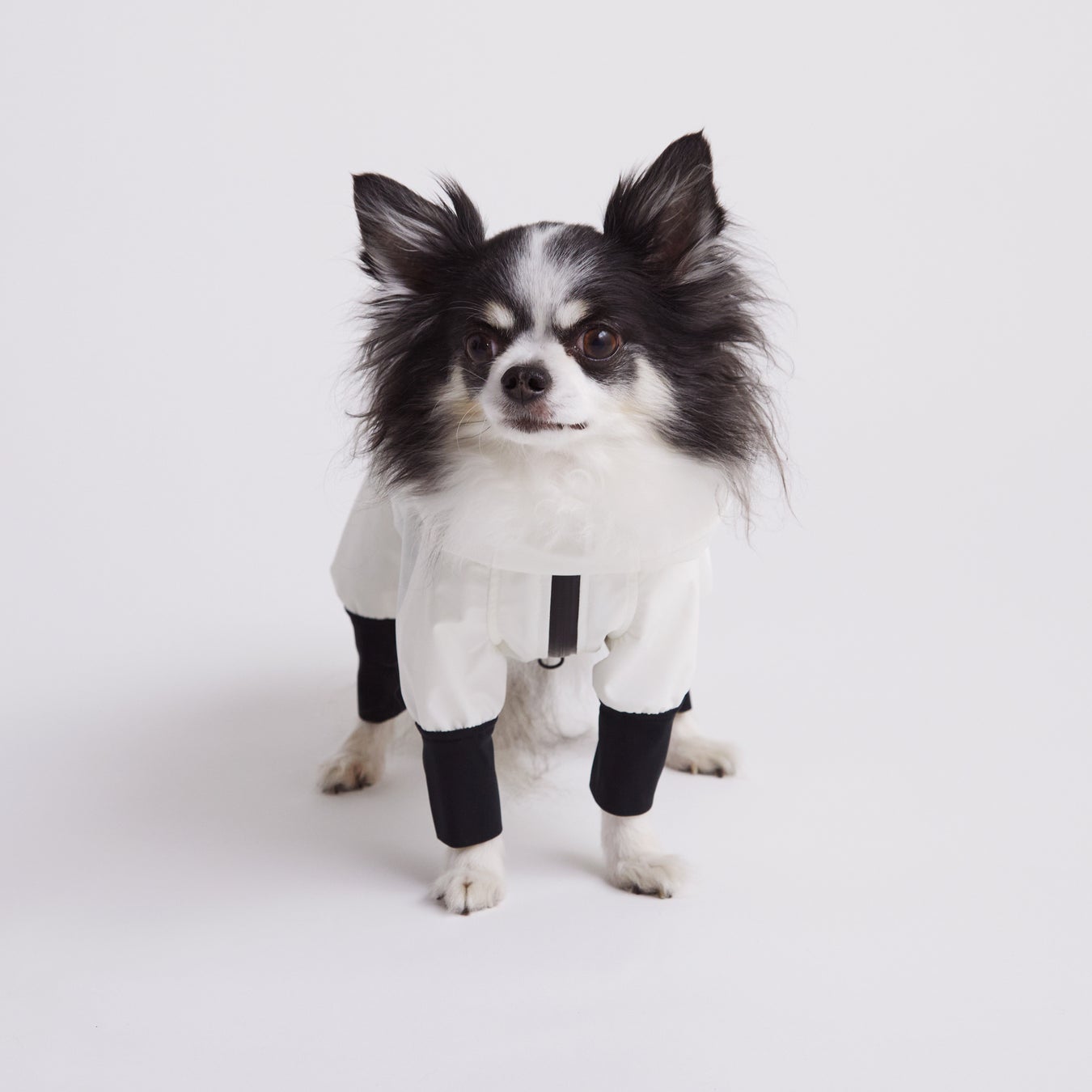 同じく人気の「Ultra Rain Suit」は、防水・防風・透湿を兼ね備える特殊ポリウレタンフィルムを使用した機能性抜群のレインスーツです。カラーは白、ベージュ、ネイビーとクラシックなバイカラーが特徴で、雨や風の強い日でもおしゃれにお散歩をお楽しみいただけます。背中のロゴは反射プリントになっており夜道のお散歩も安心。収納ポーチも付属しているため、お出かけの後にカバンにしまう際にも荷物が濡れないように持ち運んでいただけます。サイズは6展開で、2kgほどの小型犬から25kgほどの大型犬サイズまでご用意しておりますので、イベントで是非お試しください!