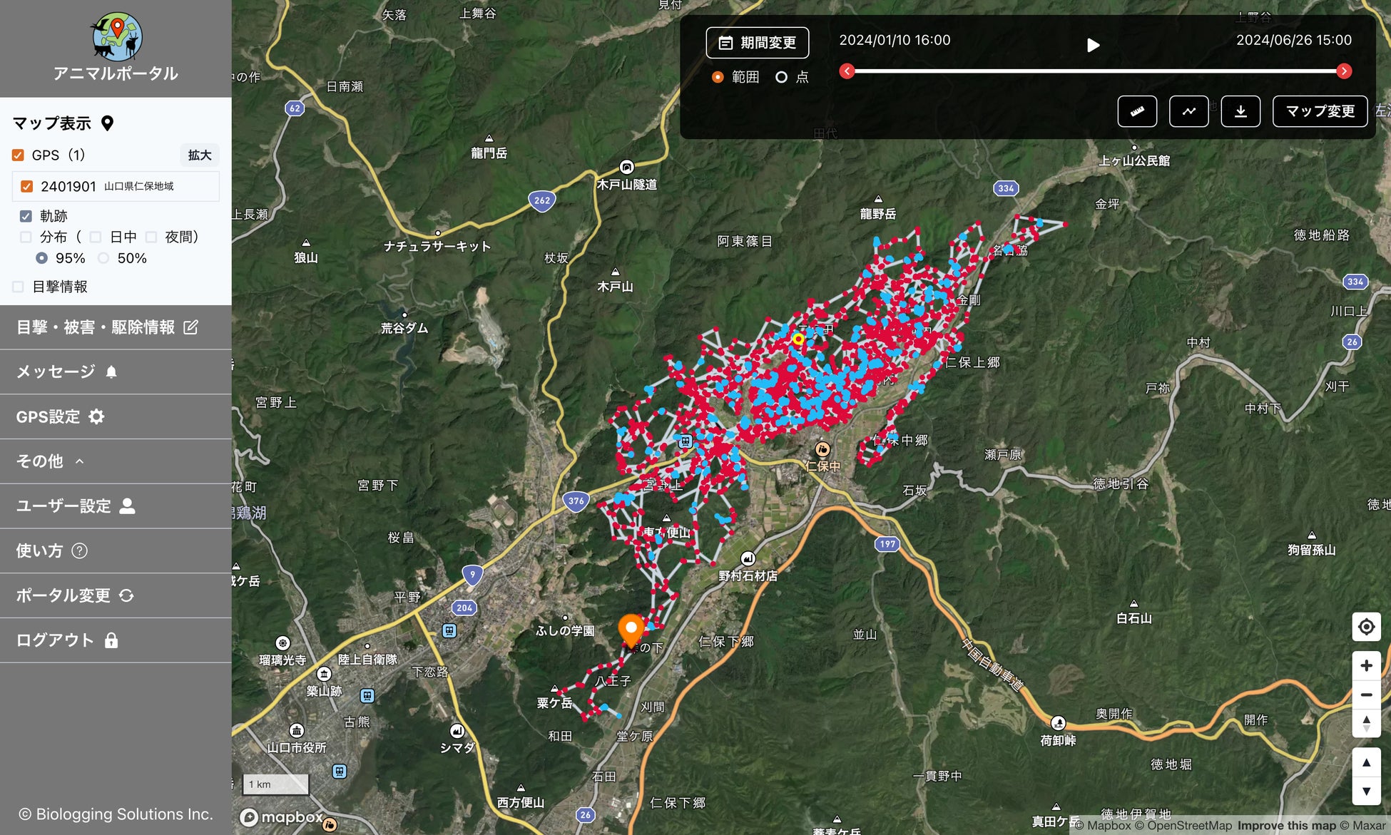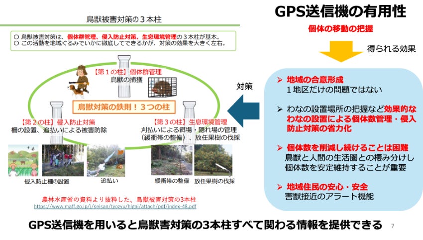 GPSデータにより、群れの移動経路の把握が可能。罠の設置場所、追払いや防護柵等の対策効果を可視化。これにより、低労力・効率的な獣害対策へ貢献。