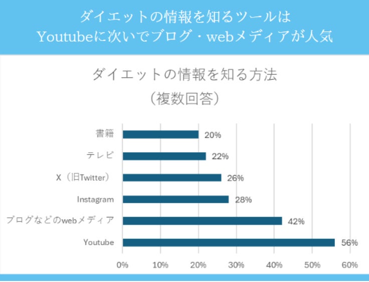 ダイエットの情報をどこで知るのかという点について50名にアンケートを行ったところ、「youtube」と回答する人が最も多く、次いで「ブログなどのwebメディア」という結果となりました。