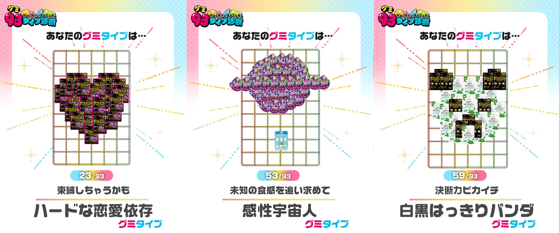 診断結果はグミにちなんで「ハードな恋愛依存グミタイプ」や「白黒はっきりパンダグミタイプ」などユニークなものばかり。93タイプ(グミタイプ)診断が会話のきっかけになり、グミニケーションを生むことを目指しています。