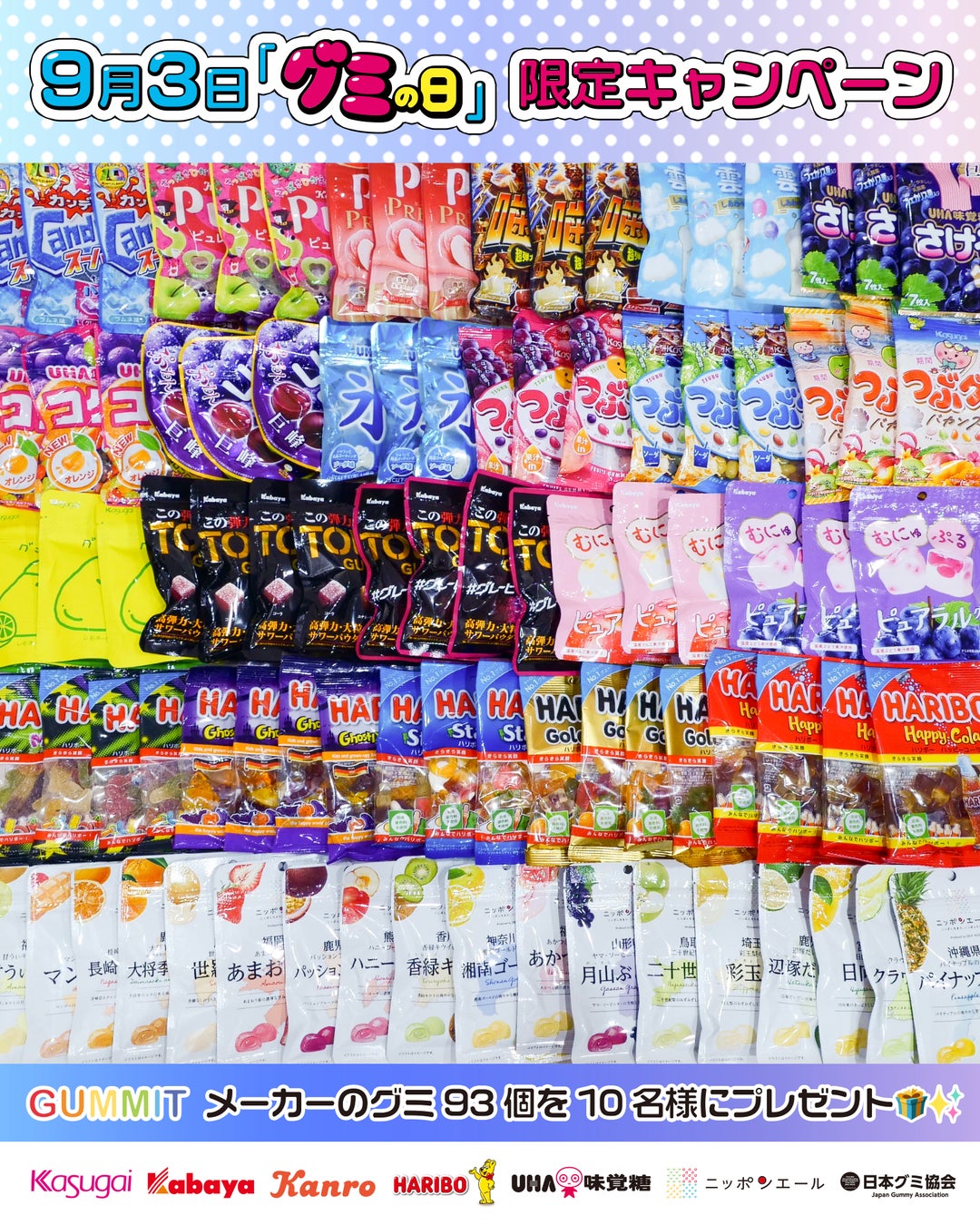 9月3日(日)のグミの日当日には、2017年のGUMMITによるグミの日キャンペーンの発足以降、毎年大人気のグミが93個当たるキャンペーンを今年も開催します。9月3日の午前8時に日本グミ協会のX(旧Twitter)から投稿されるツイートよりご参加いただけます。