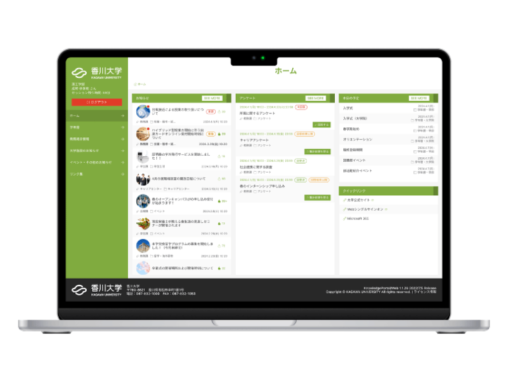 香川大学では、業務変革におけるDXを実現するため、2021年4月に情報戦略室を設置し「デジタルONE戦略」を策定されています。従来の電子メールベースのシステムでは、誤送信のリスクや情報の見落とし、連絡対象者の業務工数増大、事務連絡の閲覧確認が困難であることなど、多くの課題を有していました。これらの課題を解決するため、香川大学 情報戦略室では当社が提供する大学向け統合ポータルパッケージ「KnowledgePortal」をベースとしたコミュニケーションプラットフォーム「Digi-ONE」を開発しました。