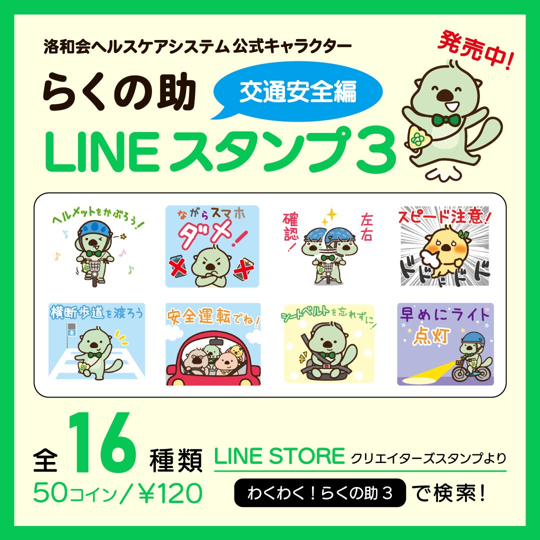 洛和会ヘルスケアシステム(以下、当会)は、当会の公式キャラクターである「らくの助」の新作LINEスタンプを発売いたしました。今回のテーマは「交通安全」であり、らくの助がヘルメットを着用して自転車の交通マナーを啓発します。