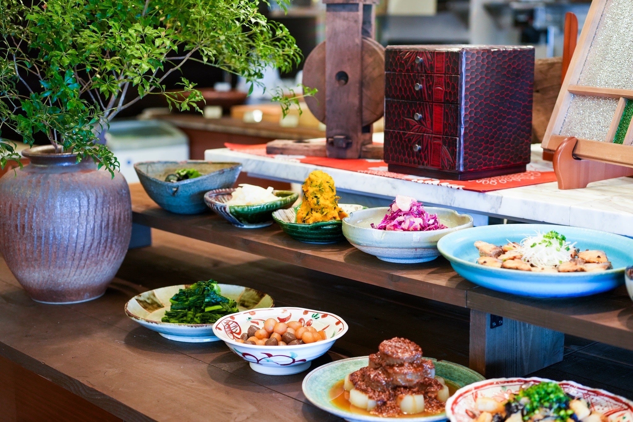 【街に健康的な和食を】和を中心とした食の総合施設。割烹レストラン&ビュッフェ《くちかほう》や、本格蕎麦と喫茶《厨 蒼日》、「暮らしにほんの少しの贅沢を」をテーマとした《食の台盤所》など3つの複合施設。