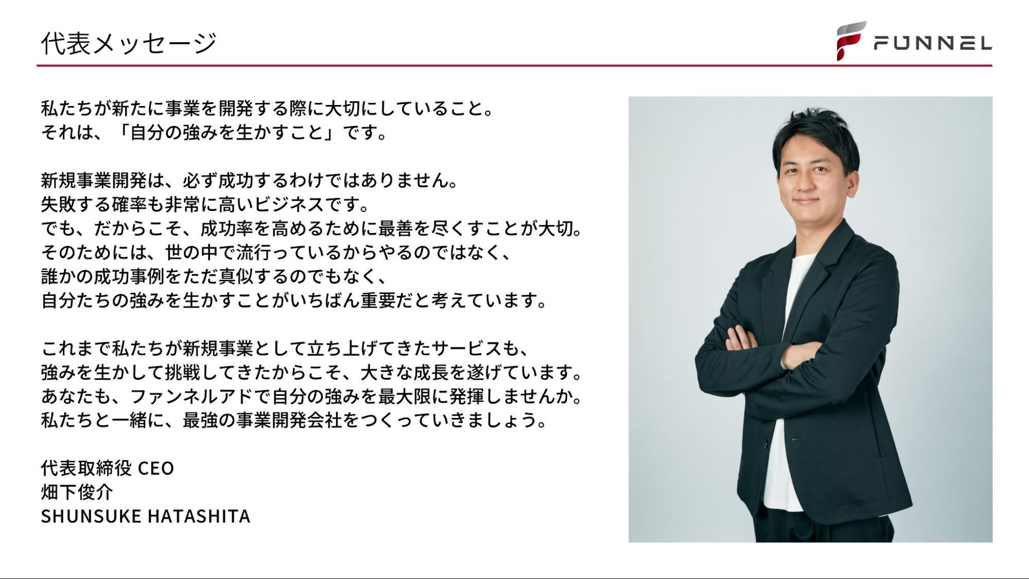 ビジネスパーソンが成長するための要素が、「企画」「仕組みづくり」「難題の問題解決」の3つであると私たちは考えており、ファンネルアドグループはそれらが揃った「圧倒的に成長できる環境」を用意できていると自負しています。