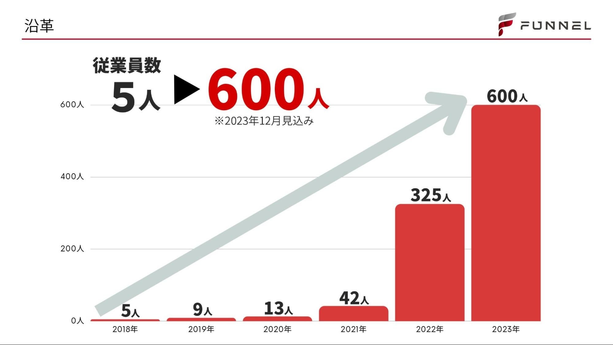 起業当初はわずか5名の従業員数でしたが、新年度に新たな仲間を迎え、現在は約109倍の543名となり、2023年目標の600名まで大きく迫ってきました!