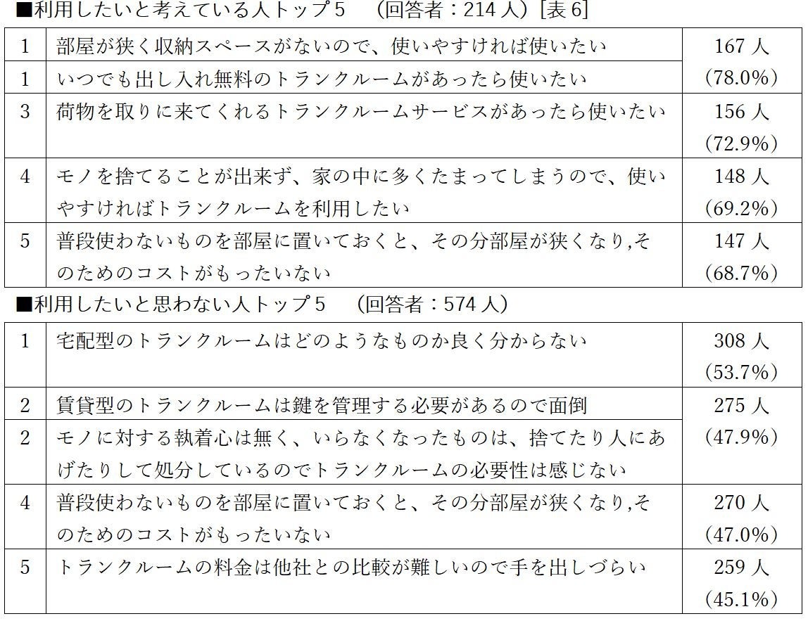 ・利用したいと思わない人のトップには「宅配型のトランクルームはどのようなものか良く分からない」という回答が半数以上の53.7%に上がり、トランクルームサービスの内容に関する認知・理解度の低さが浮き彫りとなりました。「鍵を管理するので面倒」という回答もレンタル収納と混同している人が半数近くいるようです。[表6]
