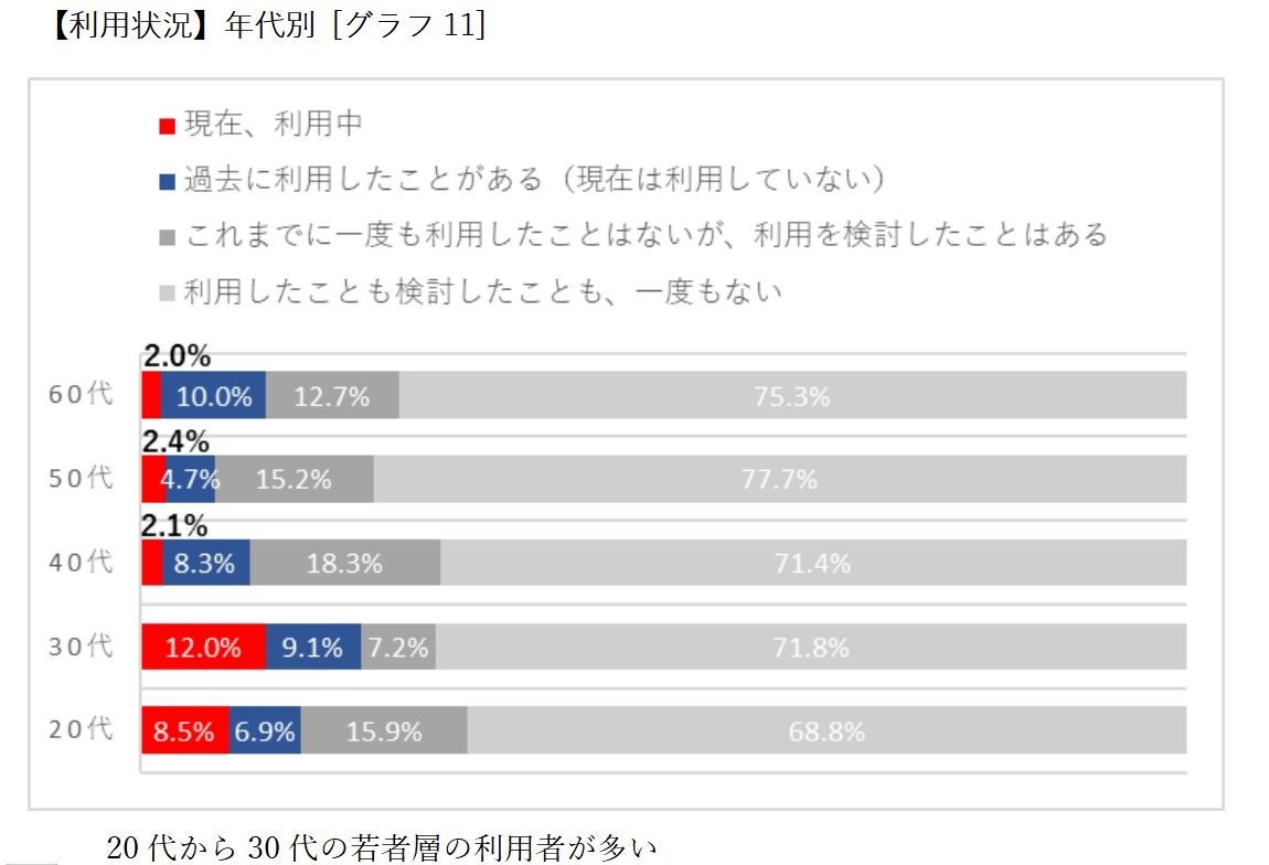 ・一方、40代、50代では「利用中」は少ないが「利用はないが検討はある」の割合が多く、今後、中高年齢層の利用が増えることが考えられます。 [グラフ11]