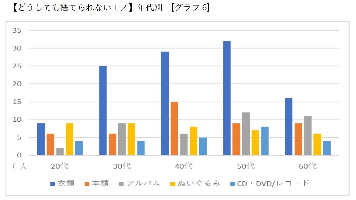 ・年齢を重ねるにつれ、捨てられない「衣類」が増える傾向にあり、50代をピークに60代で減少しています。[グラフ6]