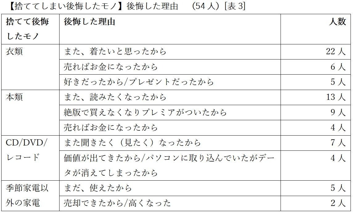 ・少数ではあるが、稀にしか使わなかった食器や来客用の布団などを「収納に困って捨てた後、すぐに使う機会が出来てしまった」という理由もあげられました。[表3]