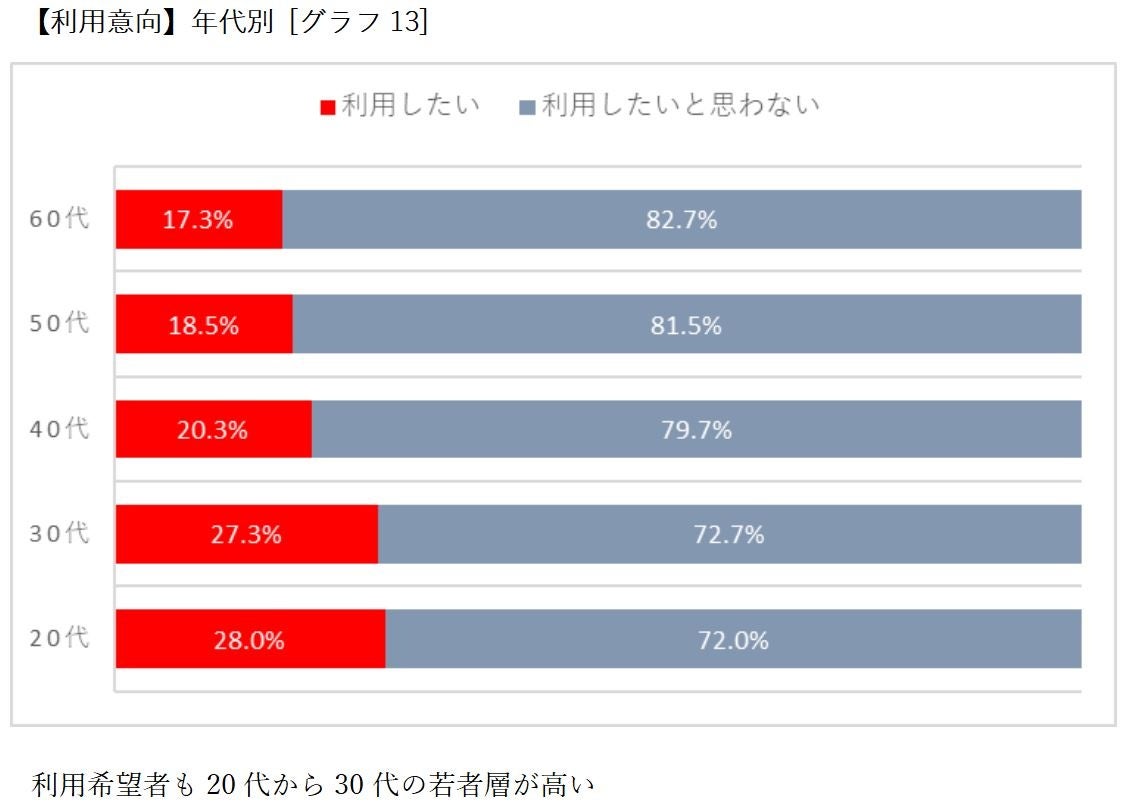 ・年代別を見ると、現状は若年層の利用意向が高く、中高年層の利用意向が低いのは、中高年層における「トランクルームサービス」の認知が獲得できていないものと推測されます。[グラフ13]