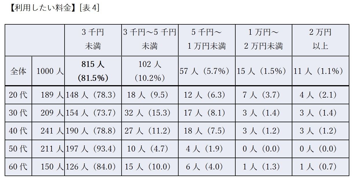 ・今回の調査では、調査対象が「トランクルームサービス」に関して、サービス内容をよく理解されていない中での調査となっていますが、若年層ほど、3千円未満の比率が下がっていることから,サービスの認知が高まることにより、料金や利用意向の傾向も変化してくると推測されます。[表4]