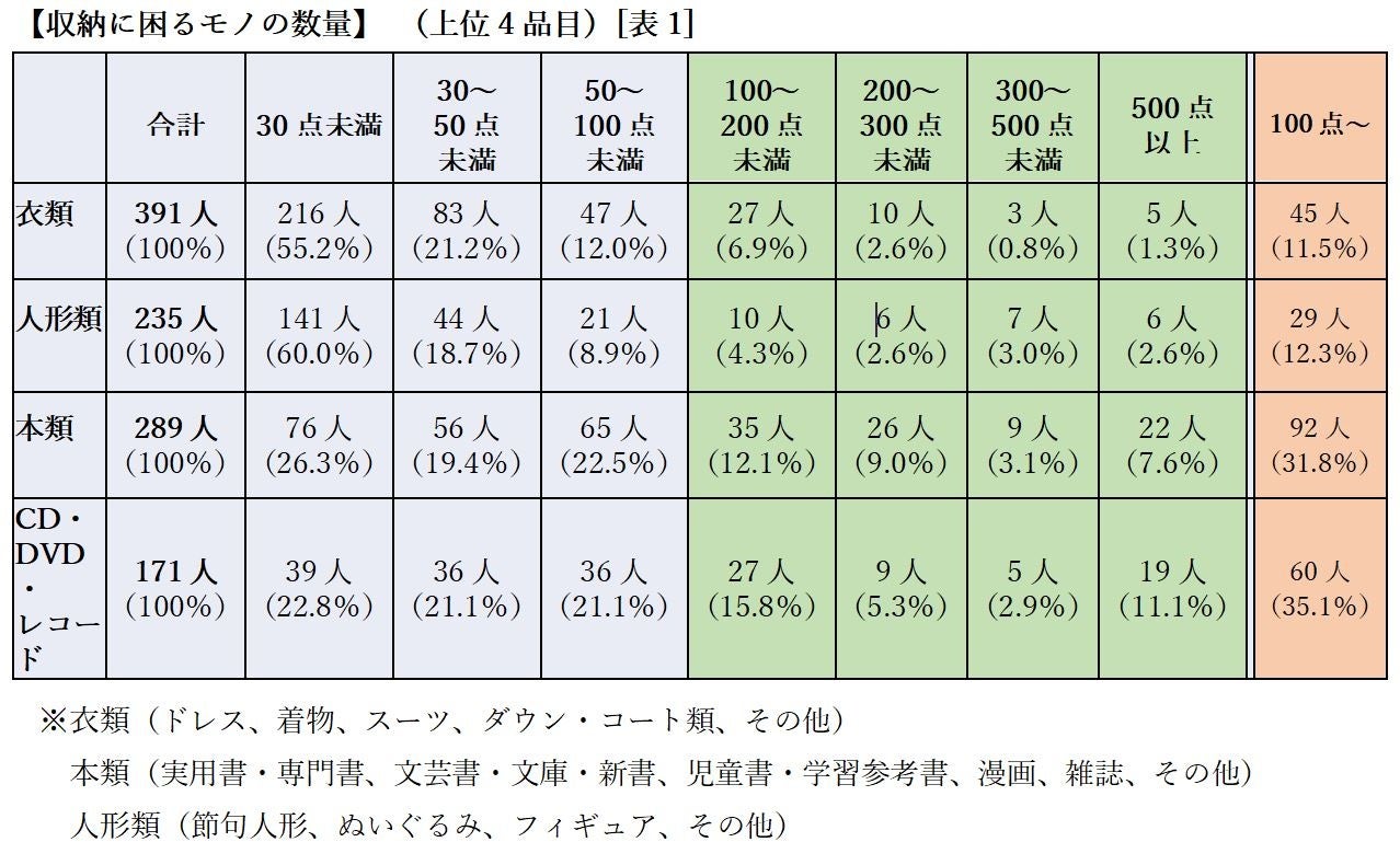 ・「衣類」などファッション関連や「人形類」は、30点未満の構成比が高いことから数量に関係なく収納に苦慮していることが伺えました。