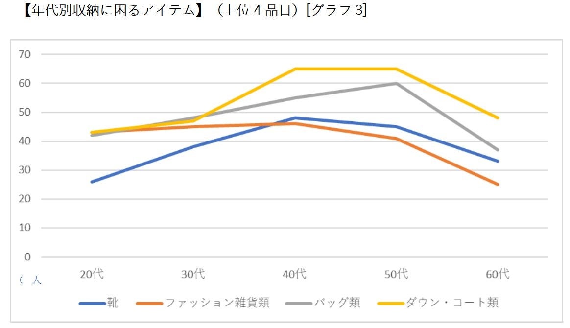 ・年代別で見ると、年齢が上がるごとに、ファッション、趣味関連のアイテムを中心とし収納に困っている人が増え、60代でそれぞれ減少しています。[グラフ3]