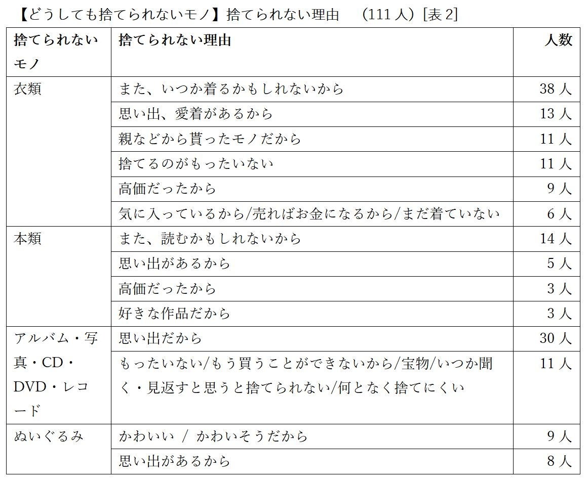 ・捨てられないモノに「衣類」をあげた111人の理由としては「また、いつか着るかもしれない」38人、「思い出・愛着がある」13人、「親などから貰ったモノ」11人、「高価だったから」9人など。次に、「本類」「アルバム・写真」「CD・DVD・レコード」については「また読むかもしれない」「思い出が詰まっているから」「聞かないけど宝物だから」などがあげられ、「ぬいぐるみ」などの人形類は、「かわいいから」「かわいそうだから」「思い出があるから」などが捨てられない理由として主にあげられました。[表2]