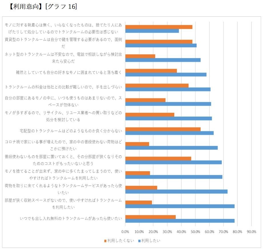 ・モノを預けることやトランクルームに関する価値観や考え方を14の任意の回答を設定し、同意する回答を利用したい人と、利用したいと思わない人に集計し、それぞれの意識意向を探ってみました。