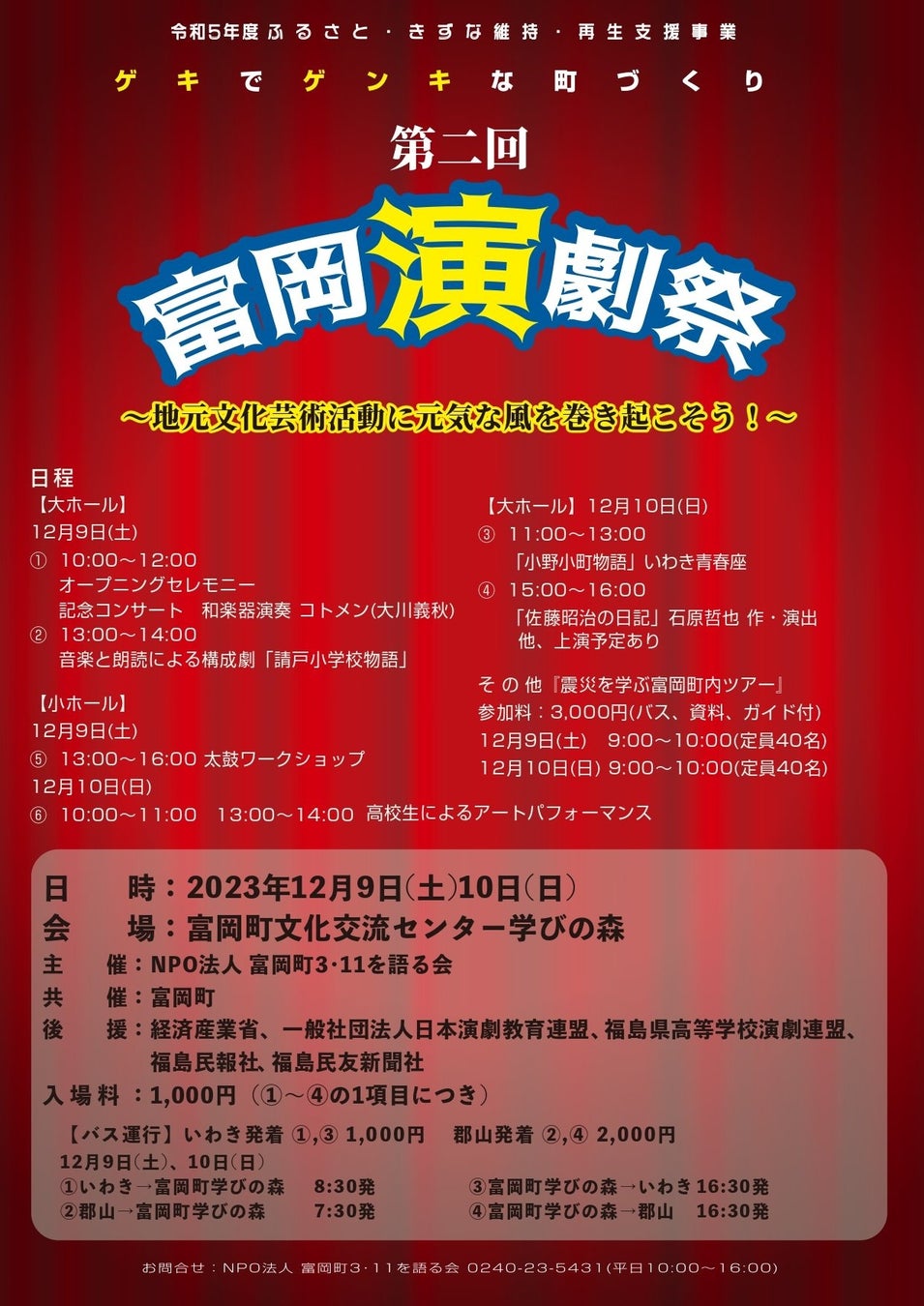 ゲキでゲンキな町づくり「第2回富岡演劇祭」~地元文化芸術活動に元気な風を巻き起こそう!~2023年12月9日(土)~10日(日) 富岡町文化交流センター学びの森