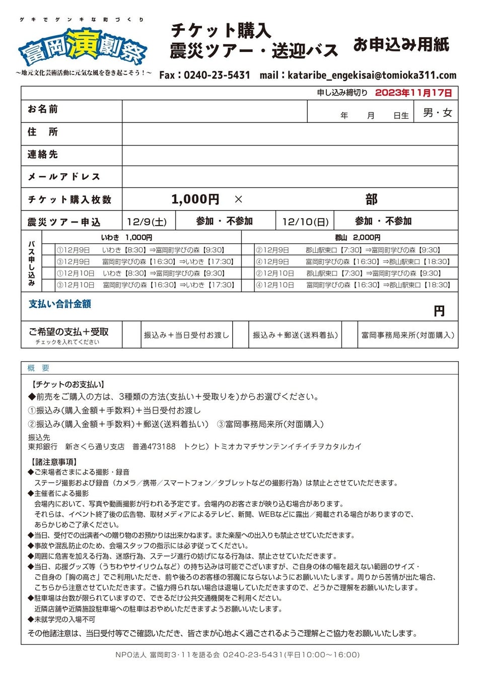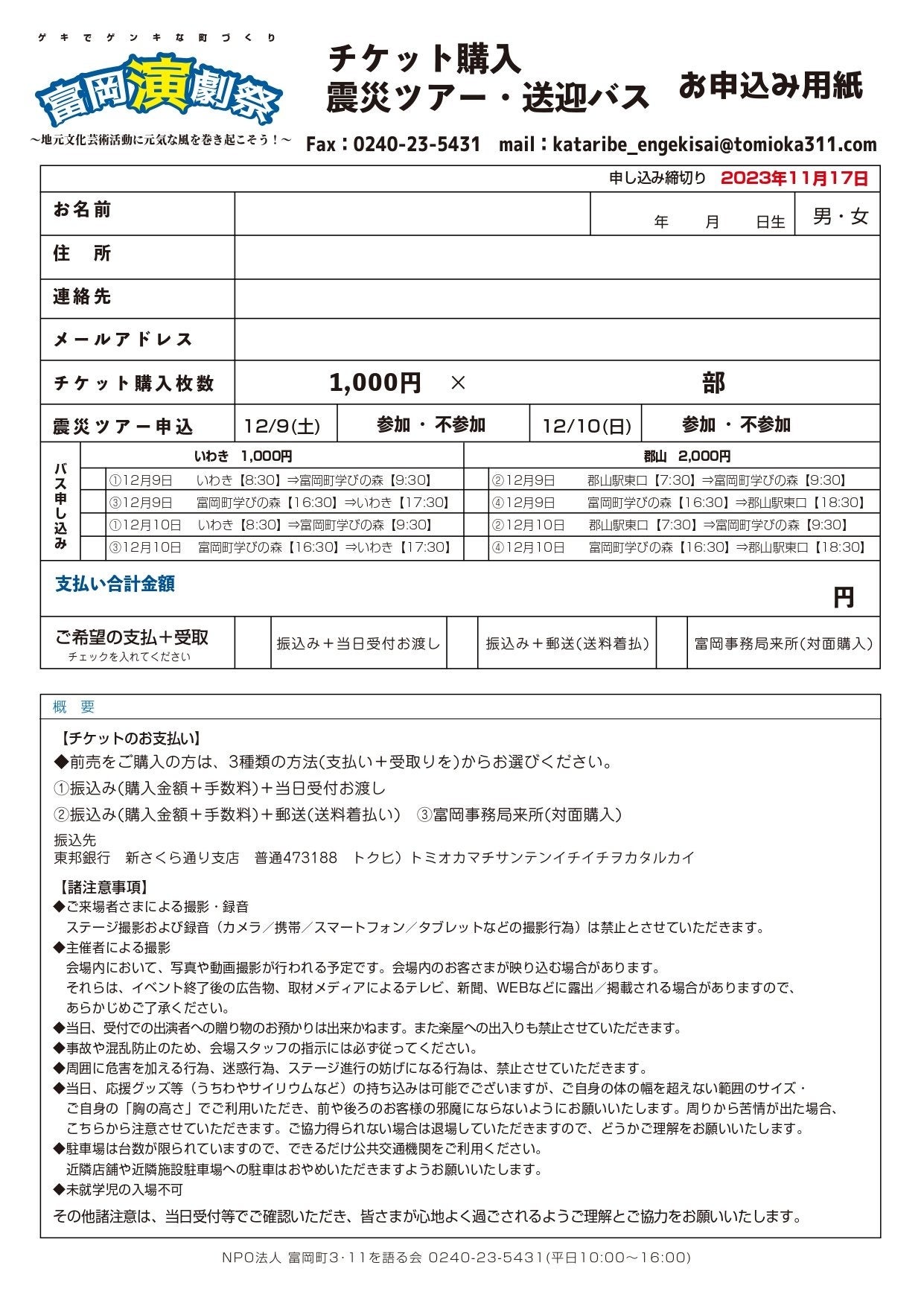 当日、富岡町文化交流センター学びの森で演劇祭受付場所でも購入できます。