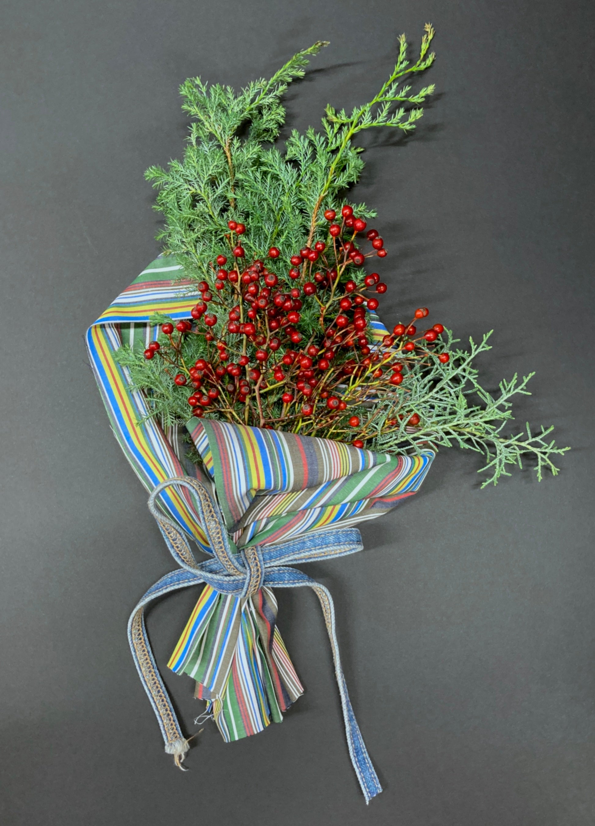 宝石をリバイブする(生き返らせる)というリバイブジュエリーにヒントを得たこのブーケは、出荷前の下処理中に派生する脇枝を活用した「SiKiTo EDA STAND」のグリーンブーケと、Shinzoneの洋服制作の過程で派生する残布をラッピングに使い、グリーンとファッションのコラボレーションから生まれました。