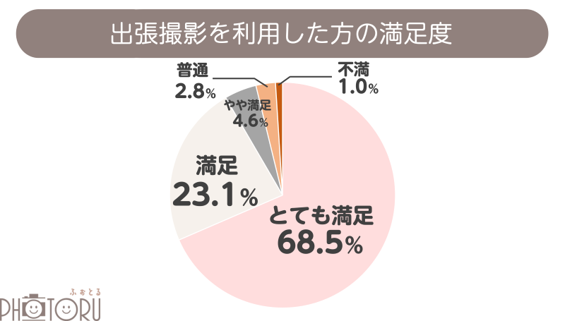 出張撮影を利用してニューボーンフォトを撮影した方の満足度の内訳をみると、とても満足が68.5%、満足が23.1%、やや満足が4.6%、普通が2.8%、不満が1.0%という結果になりました。