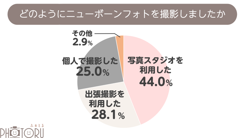 「写真スタジオ」(44.0%)が最も多く、次いで「出張撮影サービス」(28.1%)、「個人で撮影」(25.0%)という結果になりました。