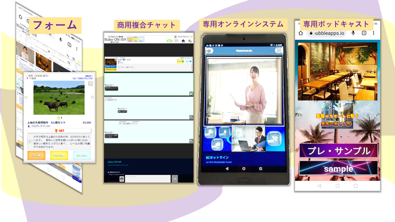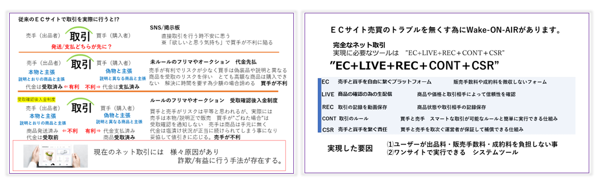 Wake-ON-AIRは従来のECでは数多くのトラブルがついてまわる 掲示板やSNSでの取引は無論トラブルは多くなる。不安の無いECプラットフォームがあれば?ネット取引が不可能と思われるサービスや職業 更に新しいビジネスフロウが実現します。