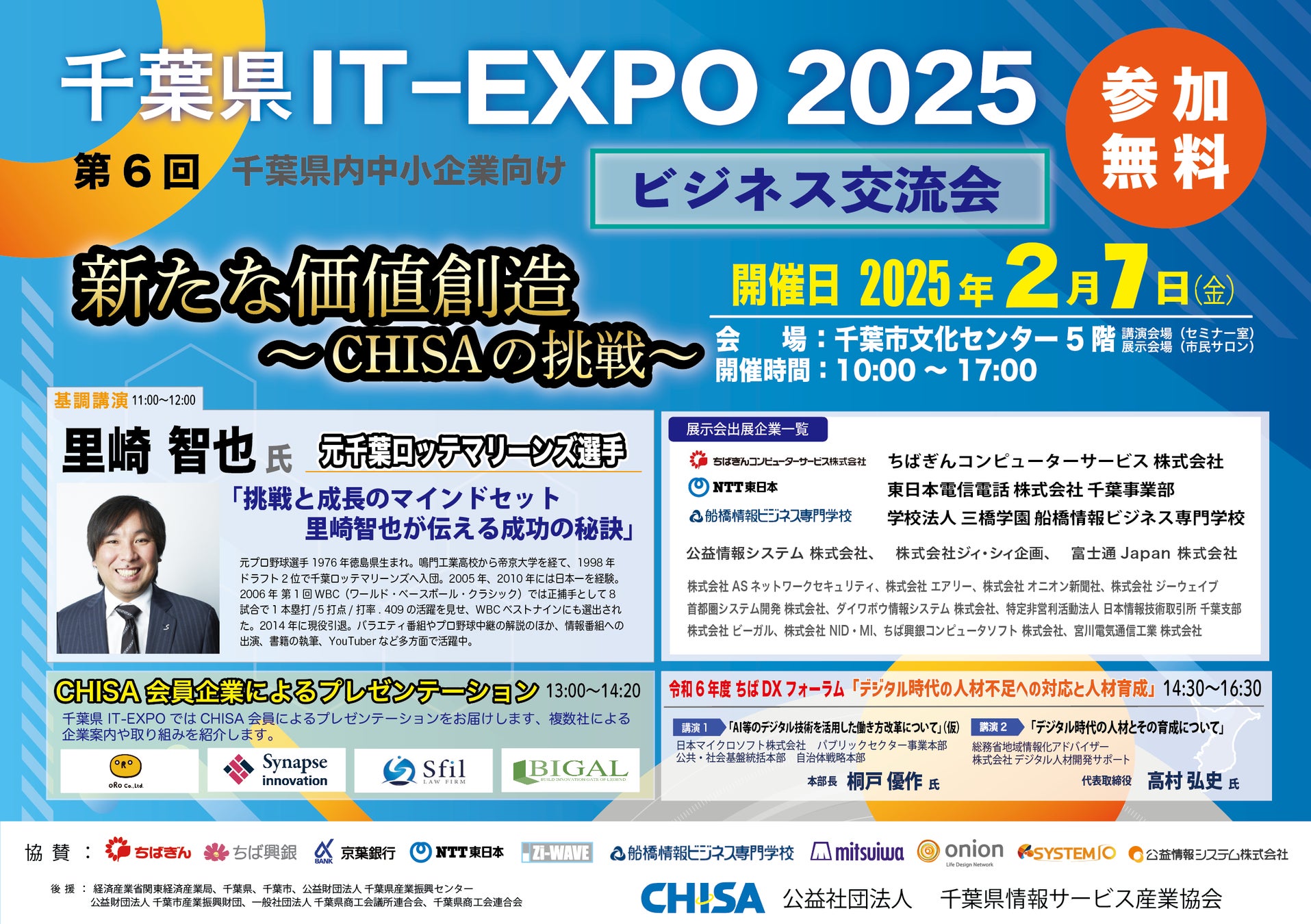公益社団法人 千葉県情報サービス産業協会(CHISA)(千葉県千葉市美浜区、会長 宮城和彦)は、2025年2月7日(金)に「千葉県IT-EXPO2025 ー第6回千葉県内中小企業向けビジネス交流会ー」を千葉市文化センター5階にて開催します。