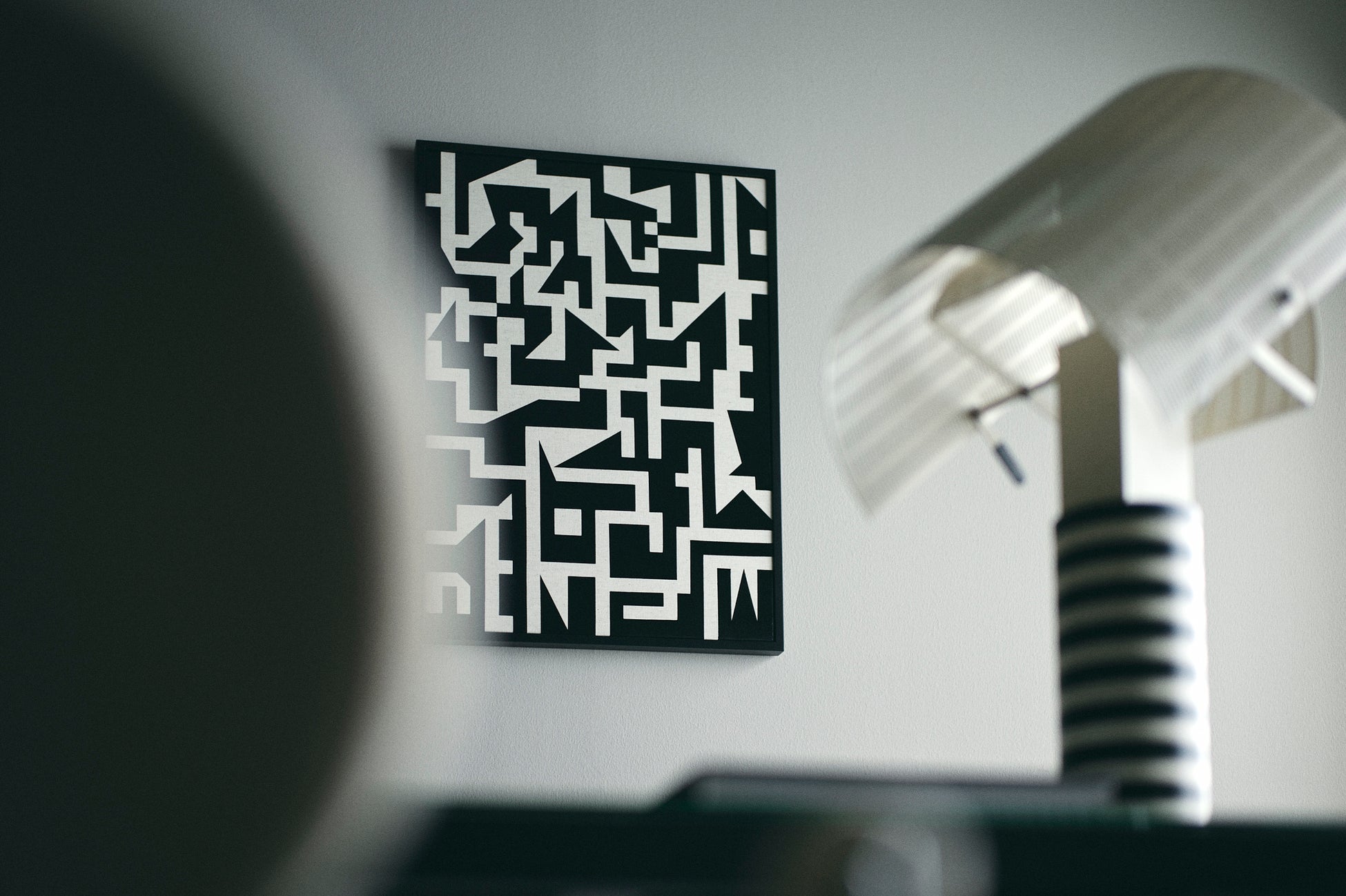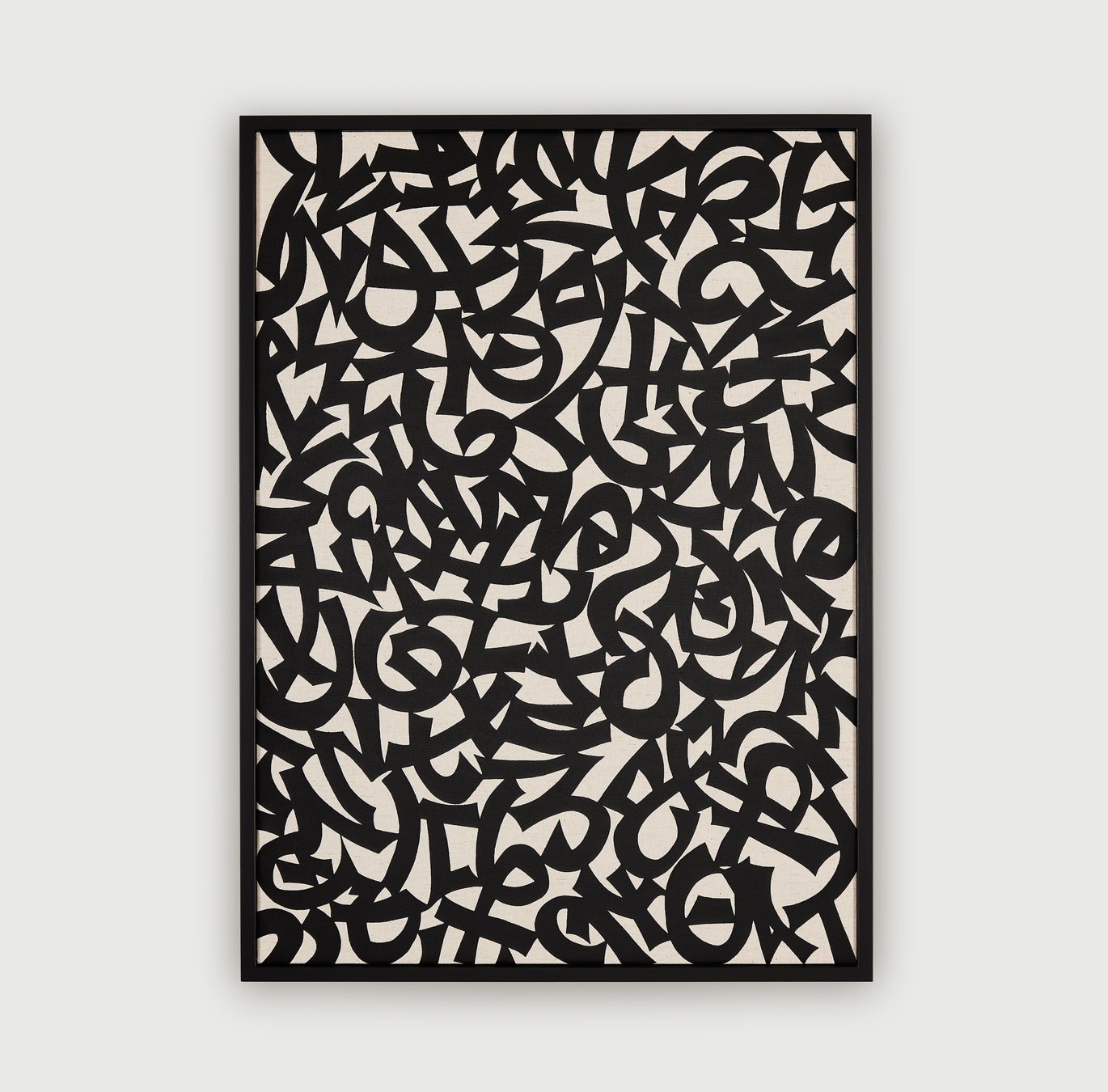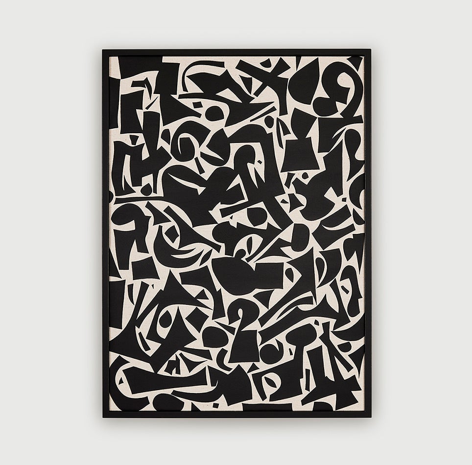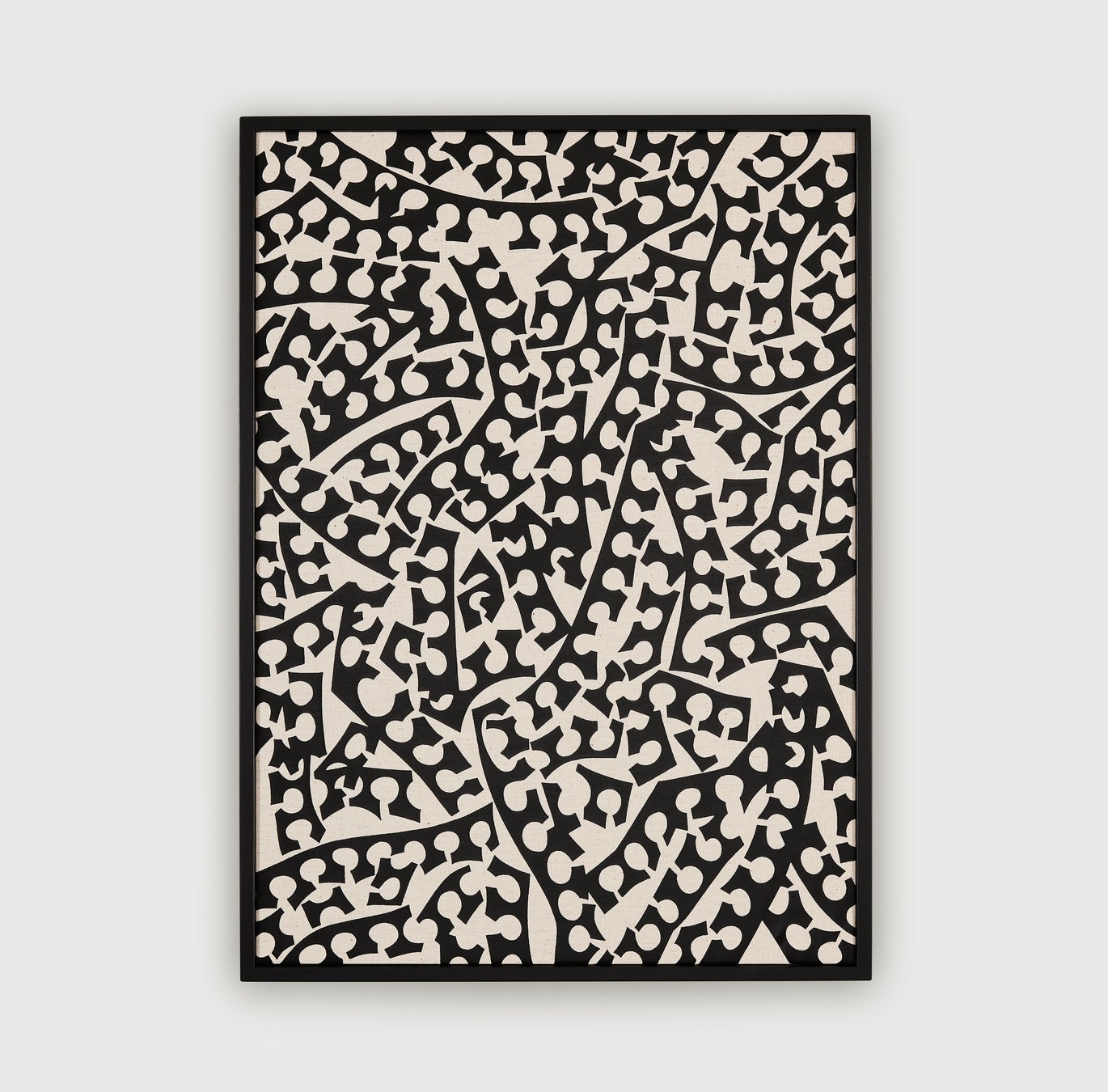 タイトル「Between black & white」は、小林氏が2019年の展覧会より続けているテーマであり、ケント紙に黒のペンで墨入れする制作過程、黒と白の純粋な形そのものの美しさを、本作では人々の生活にぬくもりや柔らかさをもたらしてきたテキスタイルというマテリアルで表現しました。