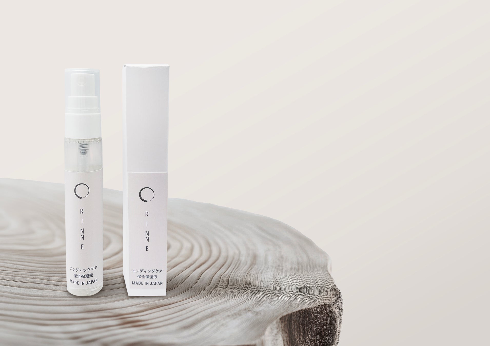 RINNEシリーズの第一弾として今回発売されるのは【保湿保全液】。葬儀社や納棺師だけでなく、最期に関わる医療従事者(看護師)、介護士、そして、ご家族まで誰でも安全な成分で、吹きかけるだけで故人様をお護りすることが叶います。