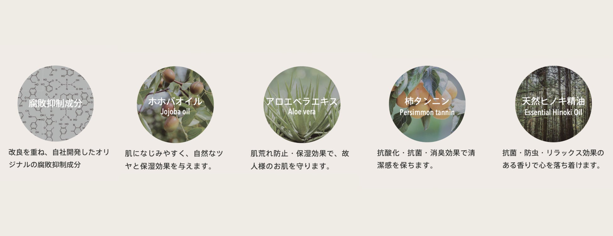 エンディングケア保全保湿液は腐敗抑制成分・消臭成分に加え、保湿成分を配合し、アロマには 100% 天然のヒノキ精油が使われています。精油は科学的な香料とは違い、植物由来の効能を持っています。故人様だけでなく、ご遺族やセレモニースタッフも使用するものなので肌に触れても安全な天然の成分を、効果効能を最大限に感じてもらえるようにしています。
