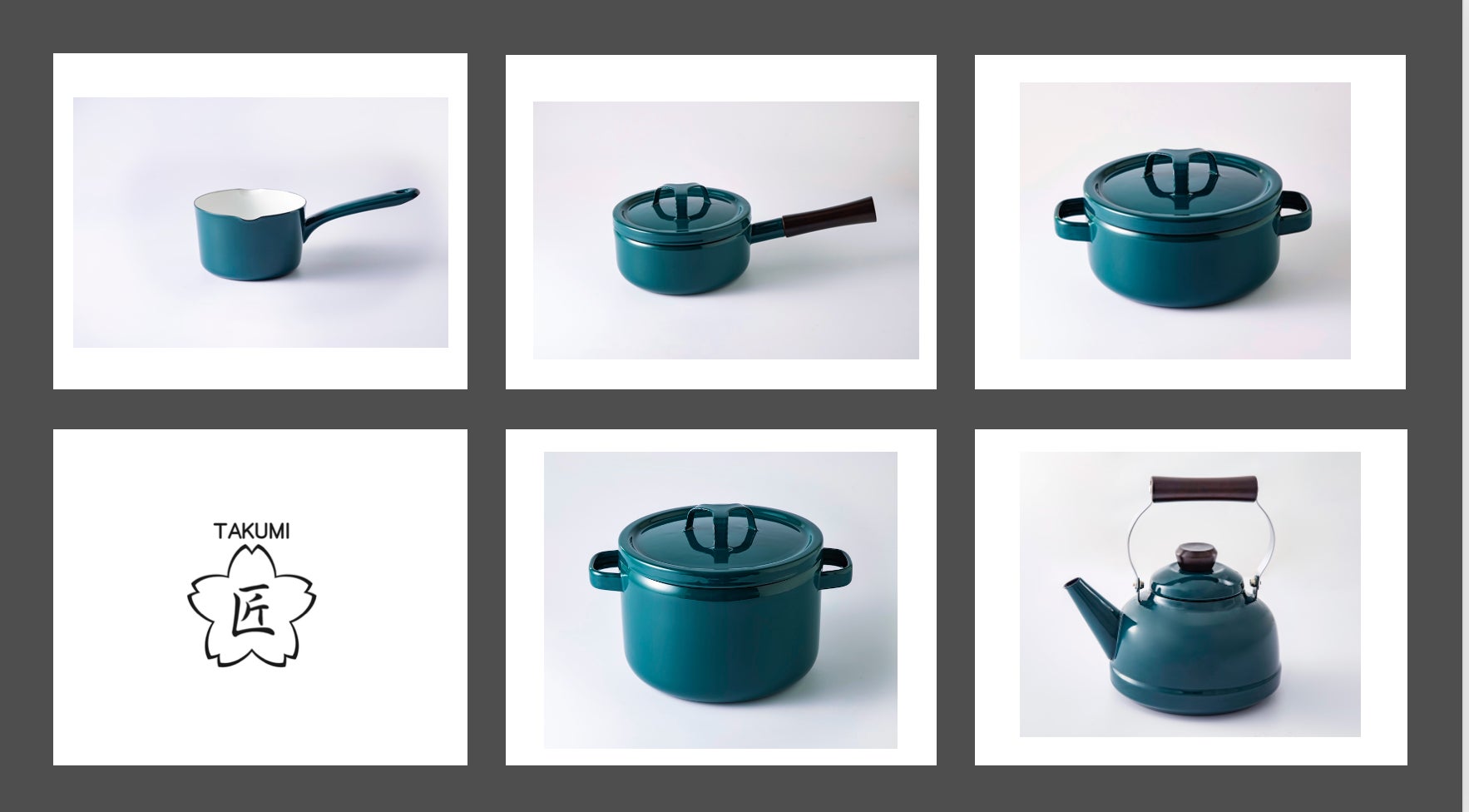 匠(TAKUMI)シリーズは、セイコー プレザージュの琺瑯ダイヤル(文字盤)に用いられる当社製琺瑯(ほうろう)の、鉄色(てついろ)を施したキッチンウェアシリーズです。ホーロー独特の柔らかい光沢が生み出す温かみのある質感を持ち、見る角度により色が変わって見える、鉄色(鉄緑・鉄黒)の深い色合いが特長です。この鉄色は、「琺瑯一筋50年余り」の当社琺瑯(ほうろう)職人、横澤満(よこさわ みつる)によるもので、横澤はセイコーウオッチ(株)の腕時計、『セイコー プレザージュ クラフツマンシップシリーズ』の文字盤も手がけ、琺瑯職人としてセイコーウオッチ(株)からも高い評価をいただいています。