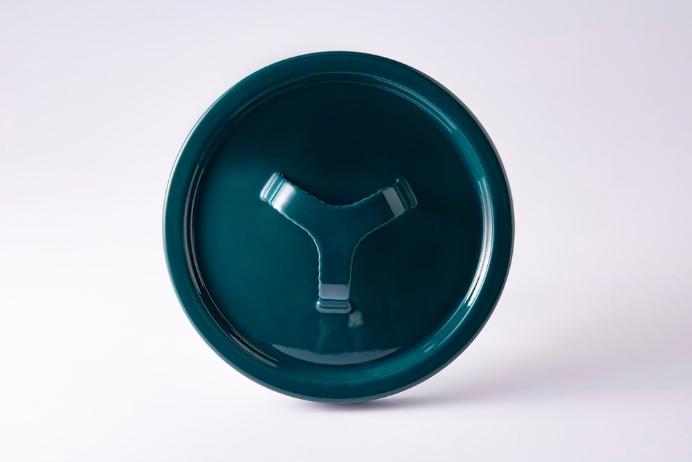 一般的な鍋の蓋についているつまみとしては珍しくまたデザイン性の高い「三又つまみ」を採用しました。非常に難しい琺瑯用鋼板(鉄)の端面に釉薬をのせるという技をつまみ部分にも色付けを実現。また、調理中、滑りやすい手やミトンや布巾でも握りやすいよう、端面には凹凸を施し、グリップ力を高めました。この技術は実用新案申請済です。