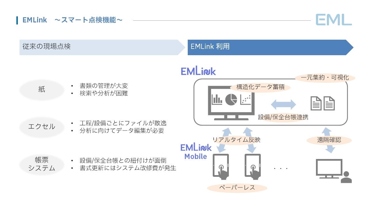 スマート点検機能により、EMLinkが目指す「現場から経営層までの一気通貫での情報集約と可視化」が一層強化されます。