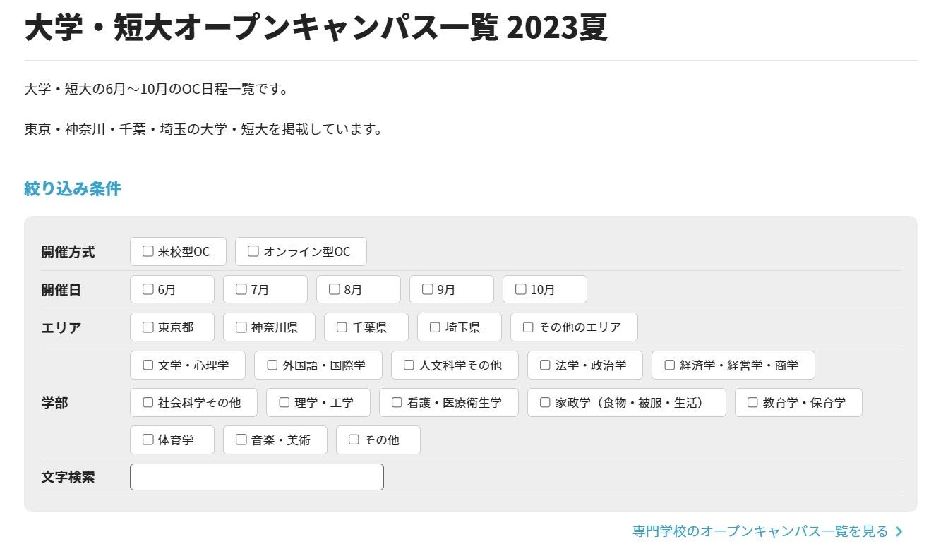 株式会社進路企画は、首都圏の大学・短大・専門学校 500校以上の6月~10月までのオープンキャンパス日程を網羅した特設ページを、公式Webサイトに公開しました。https://www.shinrokikaku.co.jp/oclist2023-2