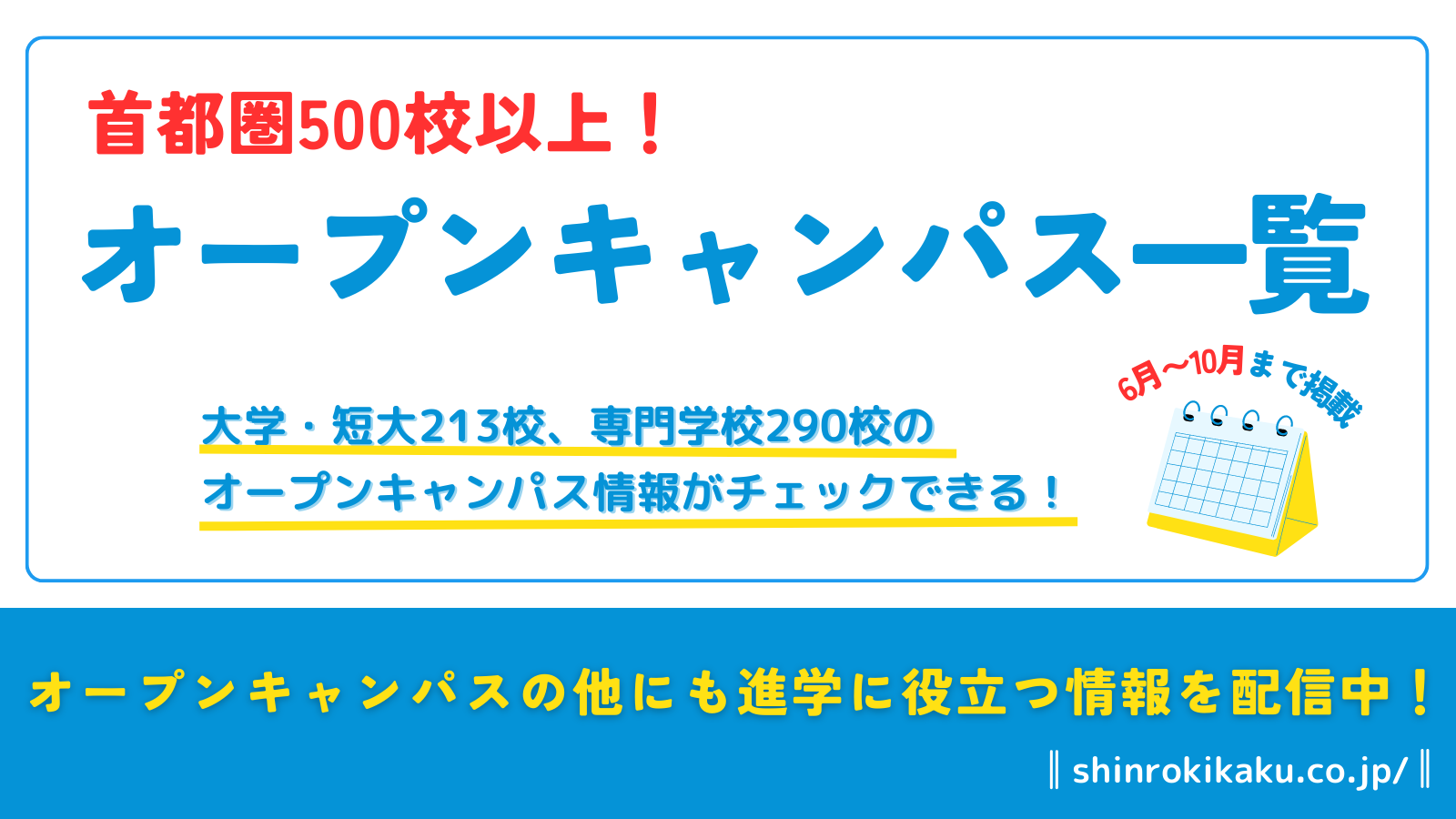 6月~10月に東京・千葉・埼玉・神奈川で実施される大学・短大213校、専門学校290校のオープンキャンパス日程が来校型・オンライン型でまとめて検索できます!