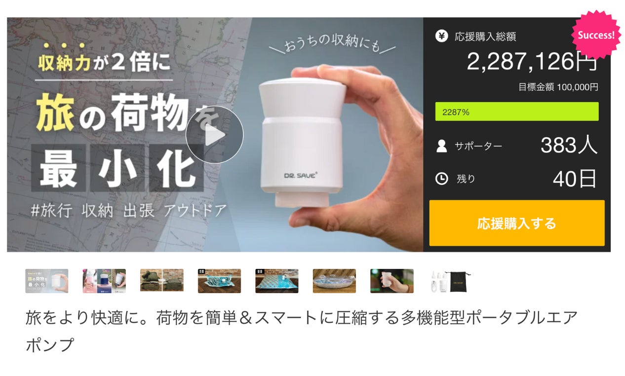 旅の荷物を『減らさずに、小さくする。』という新しいコンセプトで開発されたDR.SAVE ポータブルエアポンプの先行販売を開始。公開初日でおよそ230万円の売上を記録しました。