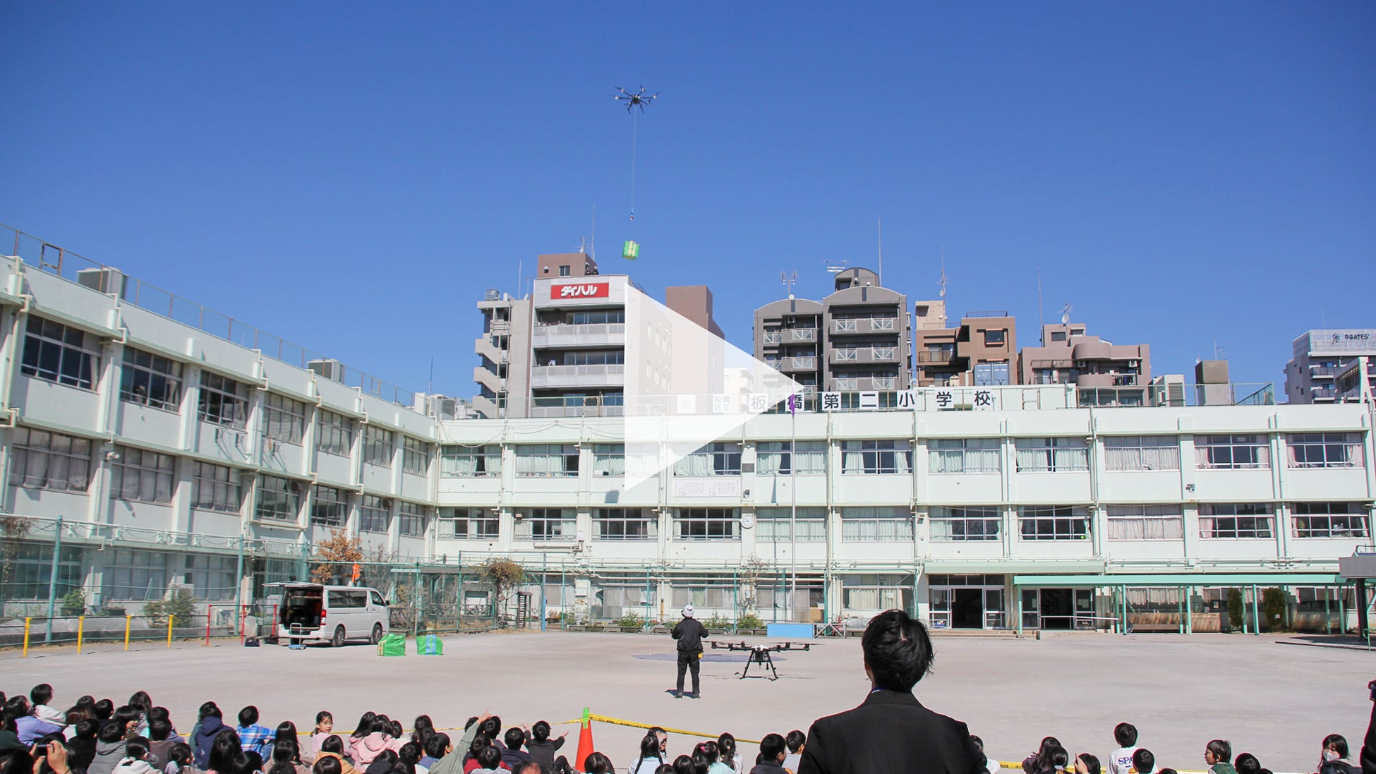 近隣ビルの屋上から離陸し、小学校のグラウンドにいる約200名の児童たちへプレゼントのポテトチップスを届けました。