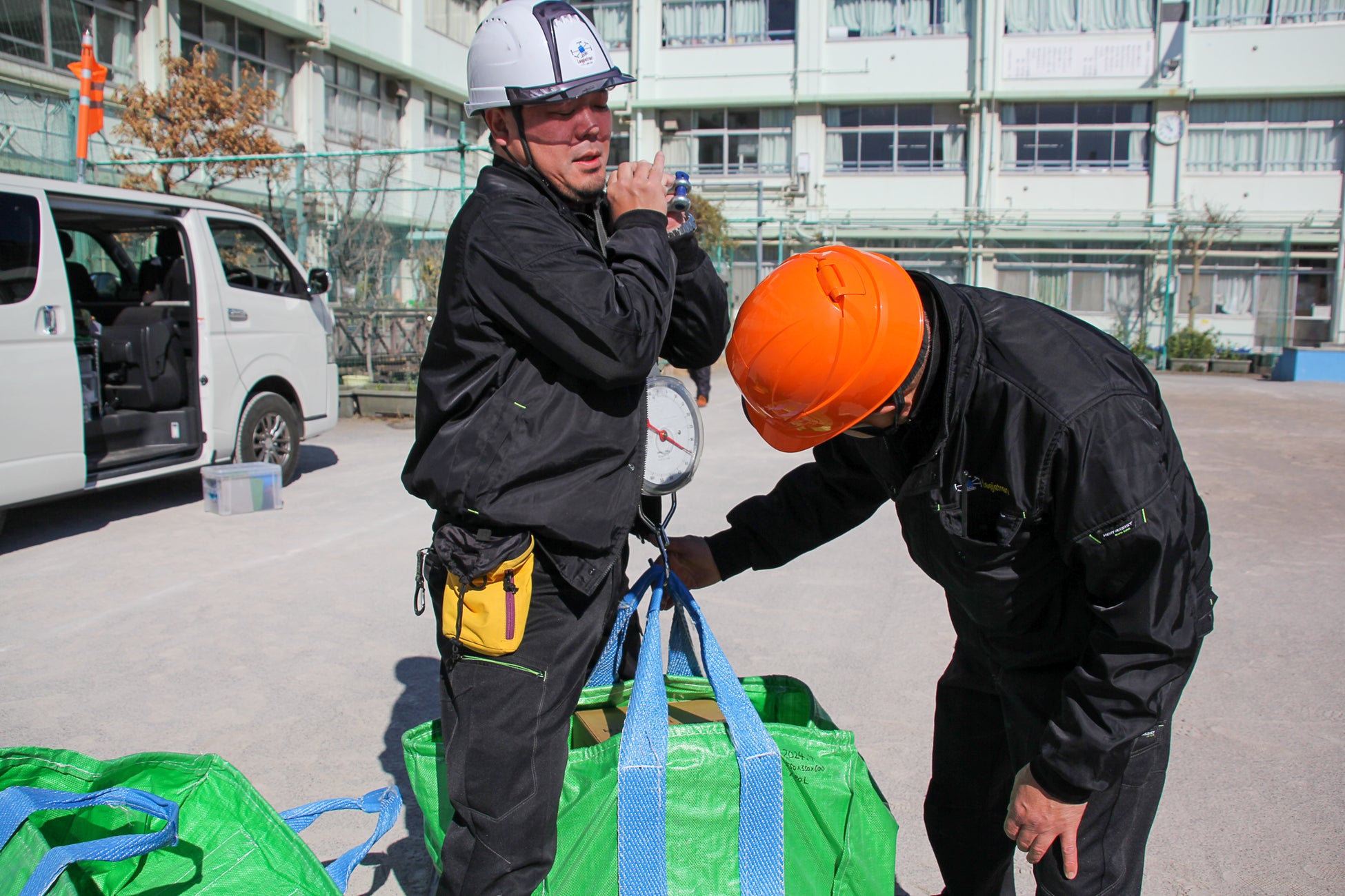 小学校のグラウンドから約35kgの支援物資をビルの屋上(高度差35m)へピストン輸送。