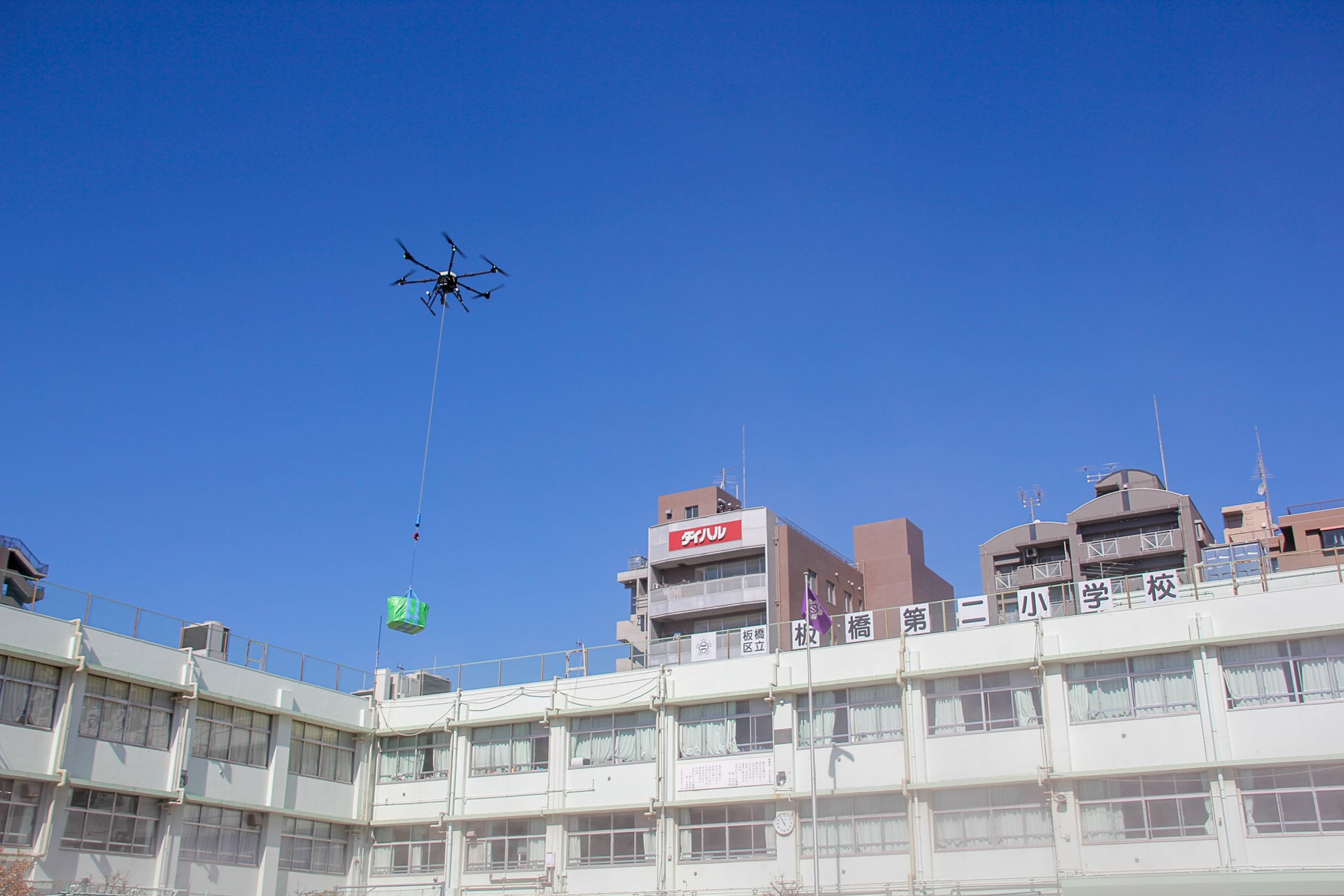 ロジクトロン/小学校校庭から近隣ビル屋上へ支援物資の垂直運搬実証実験を実施