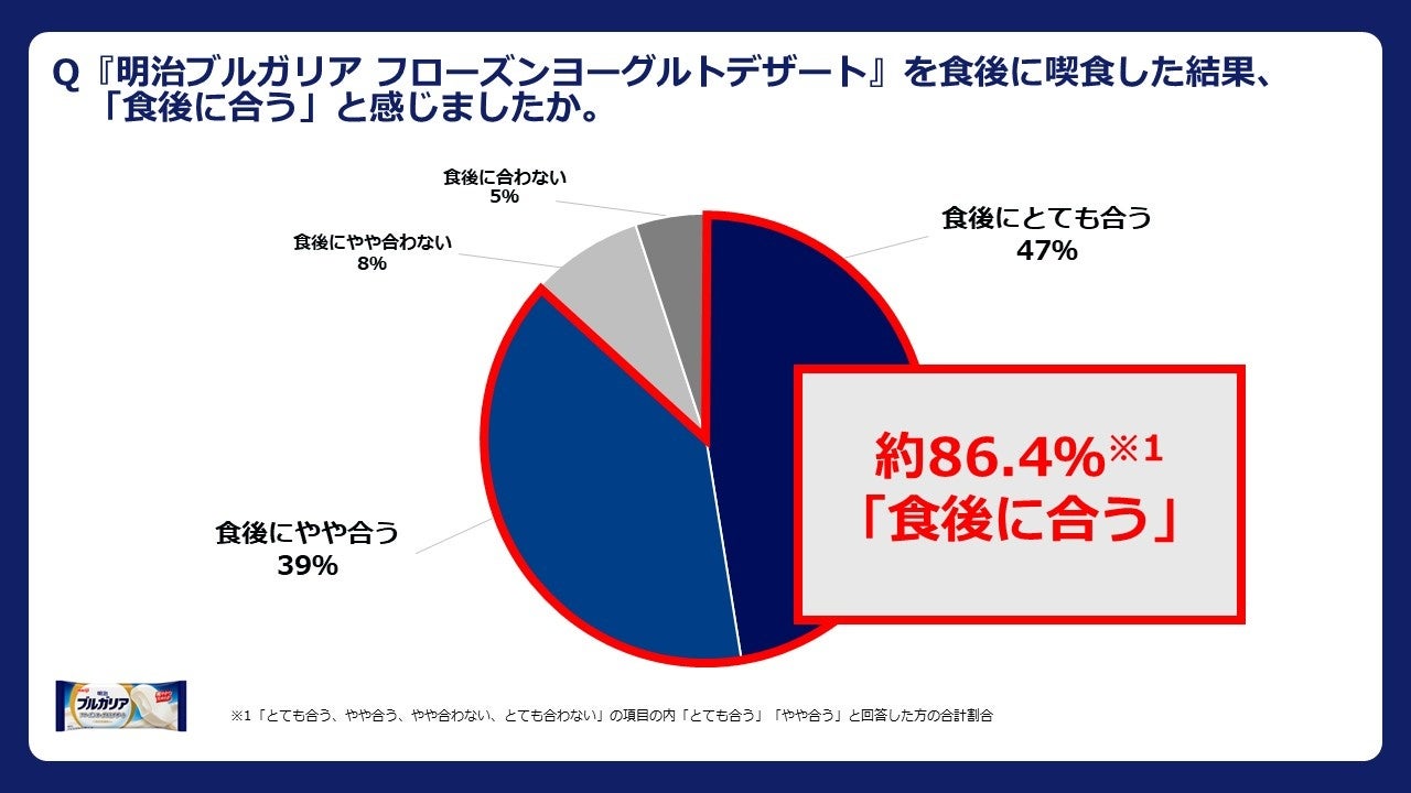 株式会社 明治(代表取締役社長:松田 克也)が展開する『明治ブルガリア フローズンヨーグルトデザート』において、一般社団法人日本味覚協会の協力のもと、20代~50代の男女118名を対象に食後に合うアイスに関する調査を実施しました。その調査の結果、約86.4%の人が食後に合うと回答しました。