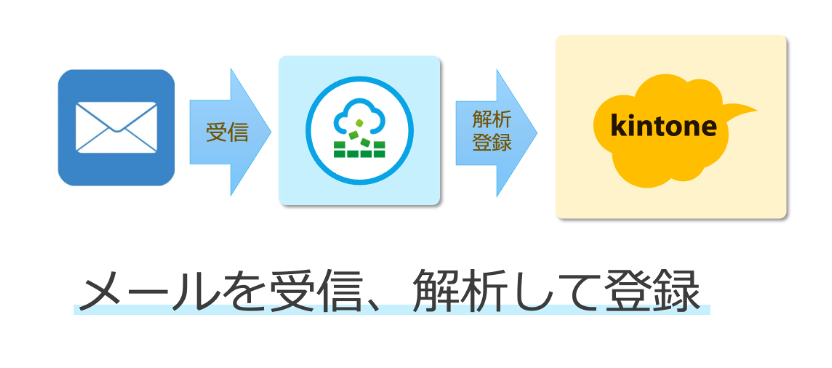 ・専用アドレス宛にメールを送信すると、題名、本文、添付ファイル等のメールコンテンツをkintoneアプリに自動登録します。