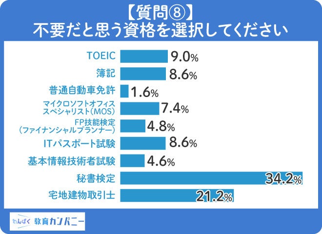 【質問⑧】社会人が不要だと思う資格の第一位は「秘書検定」
