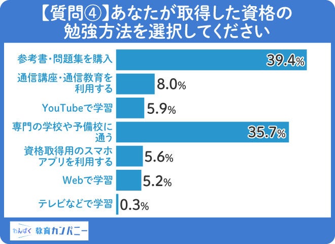資格取得のための勉強方法に関するアンケートを行うと、39.4%が「参考書・問題集を購入」と回答しました。