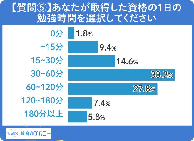 資格を取るために勉強した時間に関するアンケートでは、33.2%が一日の勉強時間は「30~60分」と回答しました。