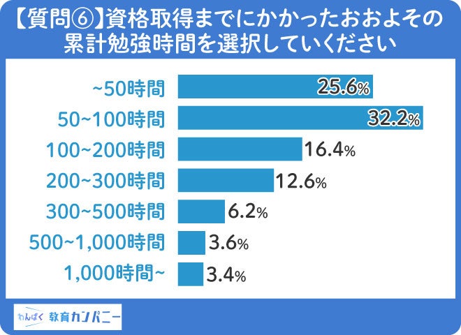 「資格取得までにかかったおおよその累計時間」に関するアンケートでは、32.2%が「50~100時間」と回答しました。